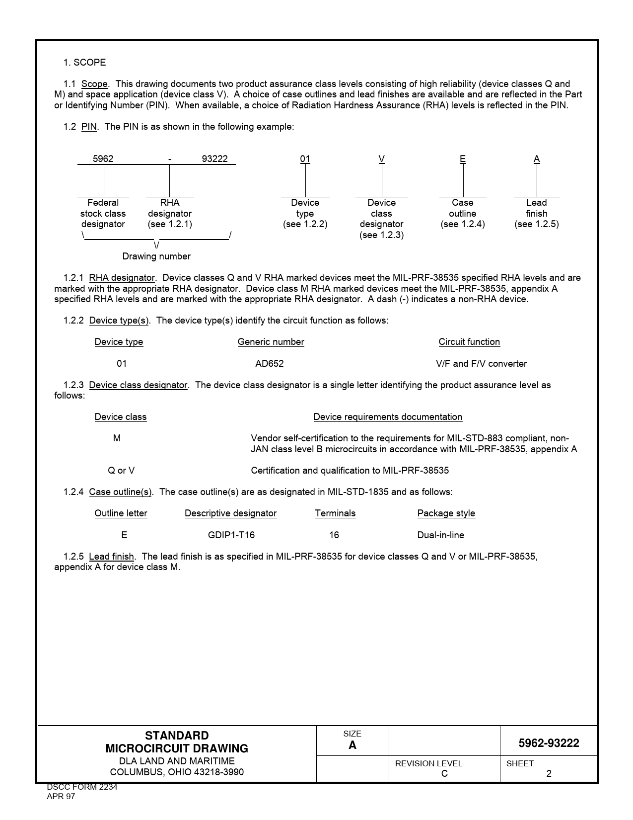 1. SCOPE 1.1 Scope. This drawing documents two product assurance class levels consisting of high reliability (device classes Q and M) and space application (device class V). A choice of case outlines and lead finishes are available and are reflected in the Part or Identifying Number (PIN). When available, a choice of Radiation Hardness Assurance (RHA) levels is reflected in the PIN. 1.2 PIN. The PIN is as shown in the following example: 5962 - 93222 01 V E A Federal RHA Device Device Case Lead stock class designator type class outline finish designator (see 1.2.1) (see 1.2.2) designator (see 1.2.4) (see 1.2.5) \ / (see 1.2.3) \/ Drawing number 1.2.1 RHA designator. Device classes Q and V RHA marked devices meet the MIL-PRF-38535 specified RHA levels and are marked with the appropriate RHA designator. Device class M RHA marked devices meet the MIL-PRF-38535, appendix A specified RHA levels and are marked with the appropriate RHA designator. A dash (-) indicates a non-RHA device. 1.2.2 Device type(s). The device type(s) identify the circuit function as follows: Device type Generic number Circuit function 01 AD652 V/F and F/V converter 1.2.3 Device class designator. The device class designator is a single letter identifying the product assurance level as follows: Device class Device requirements documentation M Vendor self-certification to the requirements for MIL-STD-883 compliant, non- JAN class level B microcircuits in accordance with MIL-PRF-38535, appendix A Q or V Certification and qualification to MIL-PRF-38535 1.2.4 Case outline(s). The case outline(s) are as designated in MIL-STD-1835 and as follows: Outline letter Descriptive designator Terminals Package style E GDIP1-T16 16 Dual-in-line 1.2.5 Lead finish. The lead finish is as specified in MIL-PRF-38535 for device classes Q and V or MIL-PRF-38535, appendix A for device class M. STANDARD SIZE 5962-93222MICROCIRCUIT DRAWINGA DLA LAND AND MARITIME REVISION LEVEL SHEET COLUMBUS, OHIO 43218-3990 C 2 DSCC FORM 2234 APR 97