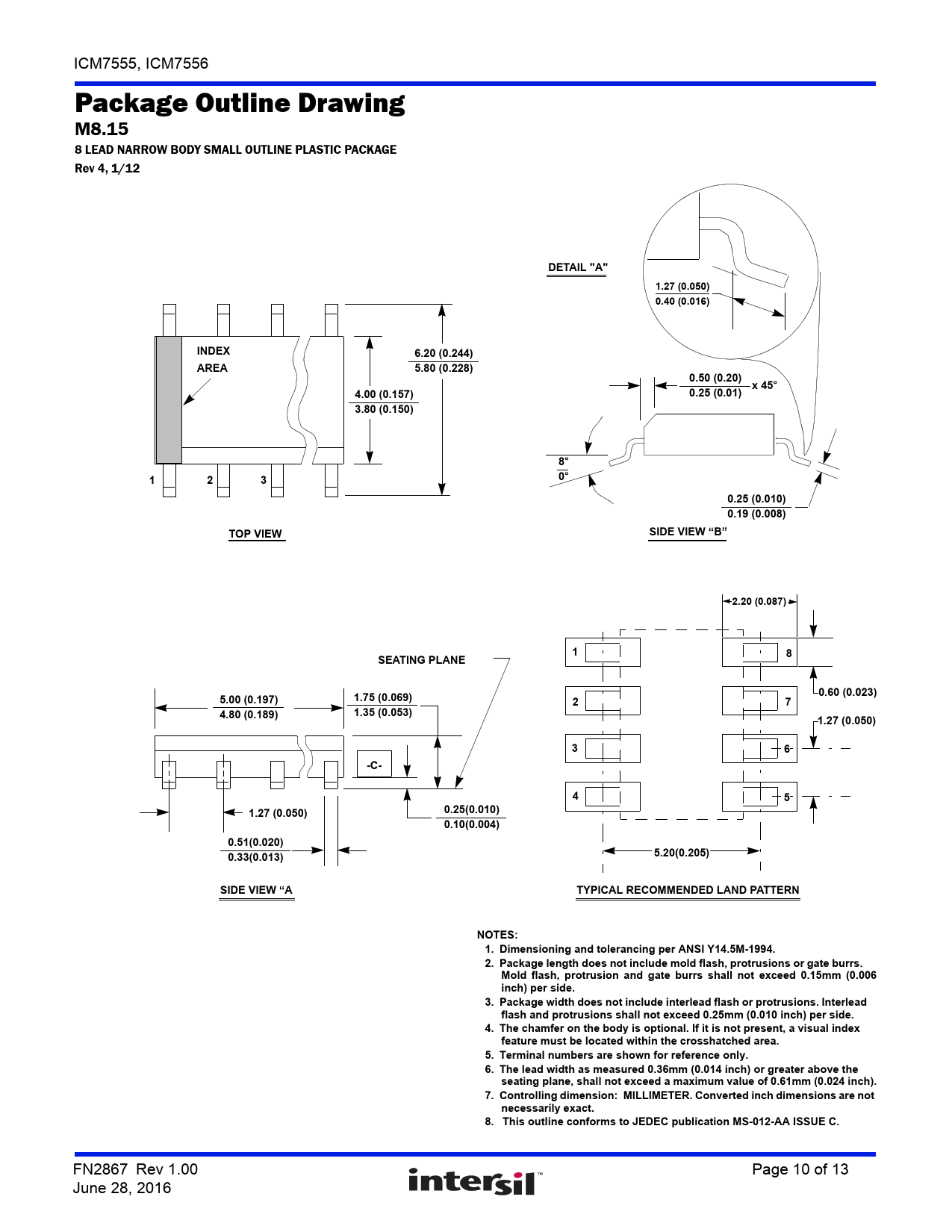 ICM7555, ICM7556 Package Outline Drawing M8.15 8 LEAD NARROW BODY SMALL OUTLINE PLASTIC PACKAGE Rev 4, 1/12