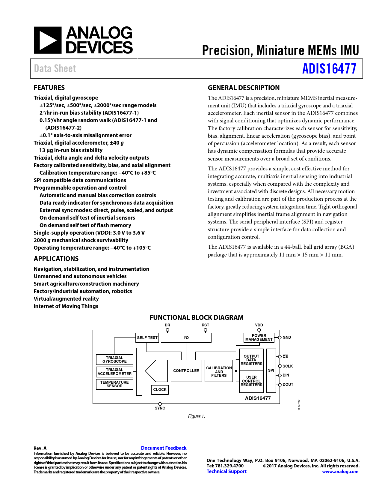 APPLICATIONS Navigation, stabilization, and instrumentation Unmanned and autonomous vehicles Smart agriculture/construction machinery Factory/industrial automation, robotics Virtual/augmented reality Internet of Moving Things FUNCTIONAL BLOCK DIAGRAM DR RST VDD POWER SELF TEST I/O GND MANAGEMENT OUTPUT CS TRIAXIAL DATA GYROSCOPE REGISTERS SCLK CALIBRATION TRIAXIAL CONTROLLER SPI AND ACCELEROMETER FILTERS DIN USER CONTROL TEMPERATURE REGISTERS DOUT SENSOR CLOCK ADIS16477