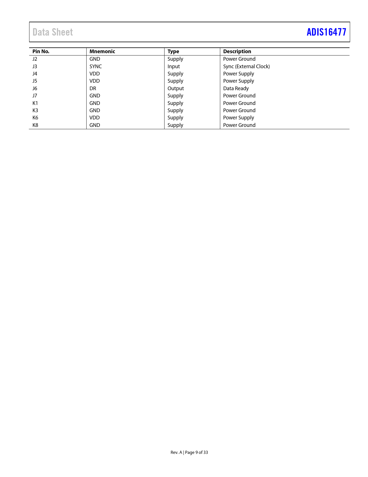 Data SheetADIS16477Pin No.MnemonicTypeDescription J2 GND Supply Power Ground J3 SYNC Input Sync (External Clock) J4 VDD Supply Power Supply J5 VDD Supply Power Supply J6 DR Output Data Ready J7 GND Supply Power Ground K1 GND Supply Power Ground K3 GND Supply Power Ground K6 VDD Supply Power Supply K8 GND Supply Power Ground Rev. A | Page 9 of 33 Document Outline Features Applications General Description Functional Block Diagram Revision History Specifications Timing Specifications Timing Diagrams Absolute Maximum Ratings Thermal Resistance ESD Caution Pin Configuration and Function Descriptions Typical Performance Characteristics Theory of Operation Introduction Inertial Sensor Signal Chain Gyroscope Data Sampling Accelerometer Data Sampling External Clock Options Inertial Sensor Calibration Bartlett Window FIR Filter Averaging/Decimating Filter Register Structure Serial Peripheral Interface (SPI) Data Ready (DR) Reading Sensor Data Burst Read Function Device Configuration Memory Structure User Register Memory Map User Register Defintions Status/Error Flag Indicators (DIAG_STAT) Gyroscope Data Gyroscope Measurement Range/Scale Factor Gyroscope Data Formatting X-Axis Gyroscope (X_GYRO_LOW and X_GYRO_OUT) Y-Axis Gyroscope (Y_GYRO_LOW and Y_GYRO_OUT) Z-Axis Gyroscope (Z_GYRO_LOW and Z_GYRO_OUT) Acceleration Data Accelerometer Resolution X-Axis Accelerometer (X_ACCL_LOW and X_ACCL_OUT) Y-Axis Accelerometer (Y_ACCL_LOW and Y_ACCL_OUT) Z-Axis Accelerometer (Z_ACCL_LOW and Z_ACCL_OUT) Internal Temperature (TEMP_OUT) Time Stamp (TIME_STAMP) Data Update Counter (DATA_CNTR) Delta Angles Delta Angle Measurement Range X-Axis Delta Angle (X_DELTANG_LOW and X_DELTANG_OUT) Y-Axis Delta Angle (Y_DELTANG_LOW and Y_DELTANG_OUT) Z-Axis Delta Angle (Z_DELTANG_LOW and Z_DELTANG_OUT) Delta Angle Resolution Delta Velocity X-Axis Delta Velocity (X_DELTVEL_LOW and X_DELTVEL_OUT) Y-Axis Delta Velocity (Y_DELTVEL_LOW and Y_DELTVEL_OUT) Z-Axis Delta Velocity (Z_DELTVEL_LOW and Z_DELTVEL_OUT) Delta Velocity Resolution Calibration Calibration, Gyroscope Bias (XG_BIAS_LOW and XG_BIAS_HIGH) Calibration, Gyroscope Bias (YG_BIAS_LOW and YG_BIAS_HIGH) Calibration, Gyroscope Bias (ZG_BIAS_LOW and ZG_BIAS_HIGH) Calibration, Accelerometer Bias (XA_BIAS_LOW and XA_BIAS_HIGH) Calibration, Accelerometer Bias (YA_BIAS_LOW and YA_BIAS_HIGH) Calibration, Accelerometer Bias (ZA_BIAS_LOW and ZA_BIAS_HIGH) Filter Control Register (FILT_CTRL) Range Identifier (RANG_MDL) Miscellaneous Control Register (MSC_CTRL) Point of Percussion Linear Acceleration Effect on Gyroscope Bias Internal Clock Mode Output Sync Mode Direct Sync Mode Pulse Sync Mode Scaled Sync Mode Decimation Filter (DEC_RATE) Data Update Rate in External Sync Modes Continuous Bias Estimation (NULL_CNFG) Global Commands (GLOB_CMD) Software Reset Flash Memory Test Flash Memory Update Sensor Self Test Factory Calibration Restore Bias Correction Update Firmware Revision (FIRM_REV) Firmware Revision Day and Month (FIRM_DM) Firmware Revision Year (FIRM_Y) Product Identification (PROD_ID) Serial Number (SERIAL_NUM) Scratch Registers (USER_SCR_1 to USER_SCR_3) Flash Memory Endurance Counter (FLSHCNT_LOW and FLSHCNT_HIGH) Applications Information Assembly and Handling Tips Package Attributes Assembly Tips PCB Layout Suggestions Underfill Process Validation and Control Power Supply Considerations Evaluation Tools Breakout Boards PC-Based Evaluation, EVAL-ADIS2 Packaging and Ordering Information Outline Dimensions Ordering Guide