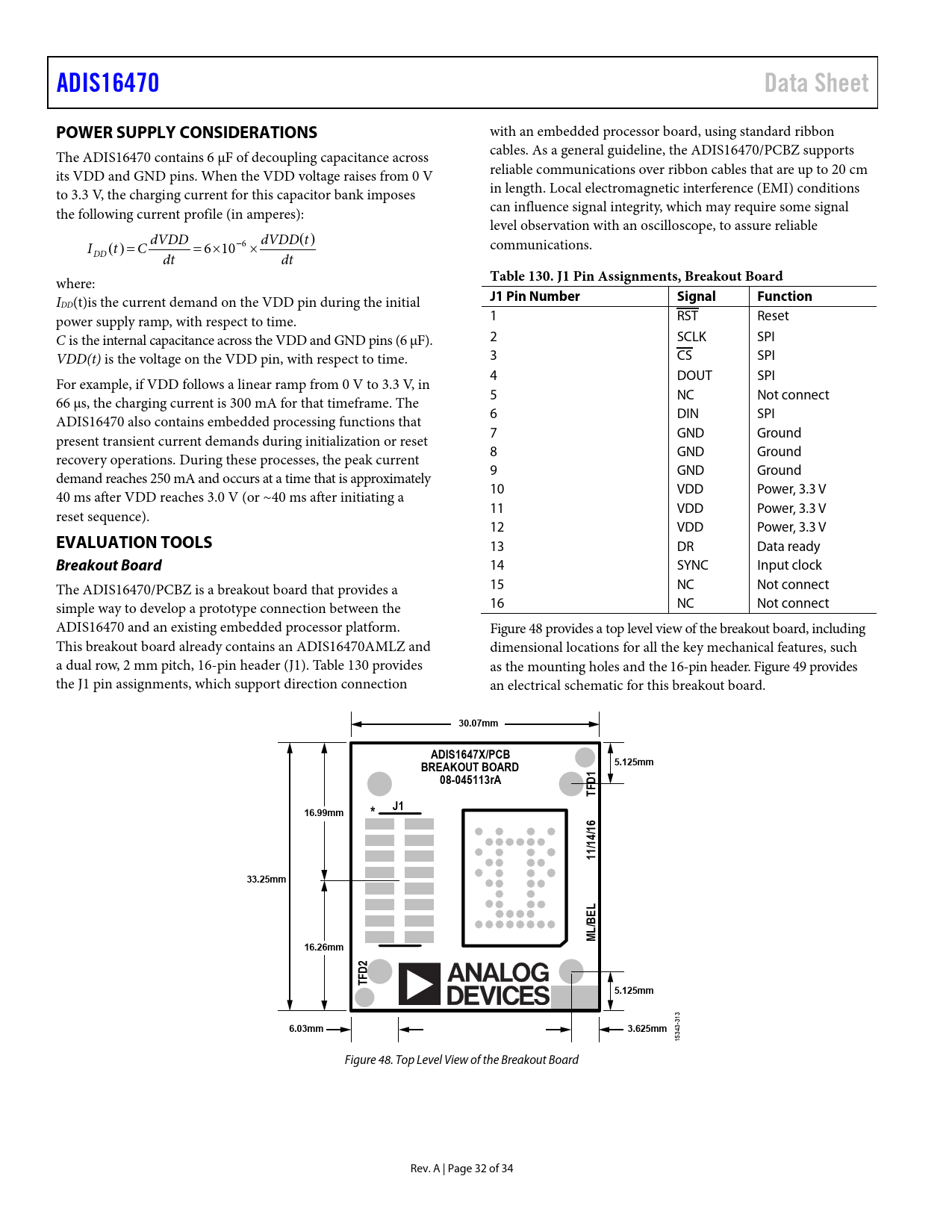 ADIS16470. Data Sheet. POWER SUPPLY CONSIDERATIONS. Table 130. J1 Pin Assignments, Breakout Board. J1 Pin Number. Signal. Function