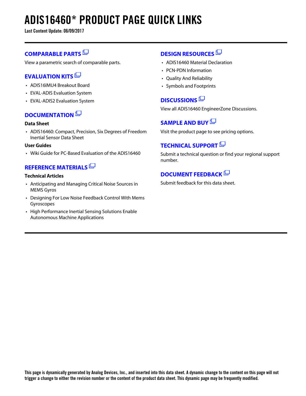 ADIS16460* PRODUCT PAGE QUICK LINKS Last Content Update: 06/09/2017COMPARABLE PARTSDESIGN RESOURCES View a parametric search of comparable parts. • ADIS16460 Material Declaration • PCN-PDN Information EVALUATION KITS • Quality And Reliability • ADIS16IMU4 Breakout Board • Symbols and Footprints • EVAL-ADIS Evaluation System • EVAL-ADIS2 Evaluation System DISCUSSIONS View all ADIS16460 EngineerZone Discussions. DOCUMENTATIONData SheetSAMPLE AND BUY • ADIS16460: Compact, Precision, Six Degrees of Freedom Visit the product page to see pricing options. Inertial Sensor Data Sheet User GuidesTECHNICAL SUPPORT • Wiki Guide for PC-Based Evaluation of the ADIS16460 Submit a technical question or find your regional support number. REFERENCE MATERIALSTechnical ArticlesDOCUMENT FEEDBACK • Anticipating and Managing Critical Noise Sources in Submit feedback for this data sheet. MEMS Gyros • Designing For Low Noise Feedback Control With Mems Gyroscopes • High Performance Inertial Sensing Solutions Enable Autonomous Machine Applications This page is dynamically generated by Analog Devices, Inc., and inserted into this data sheet. A dynamic change to the content on this page will not trigger a change to either the revision number or the content of the product data sheet. This dynamic page may be frequently modified. Document Outline FEATURES APPLICATIONS GENERAL DESCRIPTION FUNCTIONAL BLOCK DIAGRAM TABLE OF CONTENTS REVISION HISTORY SPECIFICATIONS TIMING SPECIFICATIONS Timing Diagrams ABSOLUTE MAXIMUM RATINGS ESD CAUTION PIN CONFIGURATION AND FUNCTION DESCRIPTIONS TYPICAL PERFORMANCE CHARACTERISTICS THEORY OF OPERATION READING SENSOR DATA Burst Read Function SPI Read Test Sequence DEVICE CONFIGURATION Dual Memory Structure USER REGISTERS OUTPUT DATA REGISTERS ROTATION Angular Rate Data Delta Angle Data ACCELEROMETERS Linear Acceleration Delta Velocity Data INTERNAL TEMPERATURE PRODUCT IDENTIFICATION STATUS/ERROR FLAGS Manual Flash Update SPI Communication Failure Sensor Overrange Self Test Failure Flash Test Failure Input Clock Sync Failure SYSTEM FUNCTIONS GLOBAL COMMANDS SOFTWARE RESET FLASH MEMORY TEST MANUAL FLASH UPDATE AUTOMATED SELF TEST INPUT/OUTPUT CONFIGURATION DATA READY (DR) PIN CONFIGURATION SYNC PIN CONFIGURATION Sample Time Indicator Precision Input Sync with Data Counter Direct Sample Control DIGITAL PROCESSING CONFIGURATION GYROSCOPES/ACCELEROMETERS Digital Filtering CALIBRATION GYROSCOPES Gyroscope Bias Error Estimation Gyroscope Bias Correction Factors Single Command Bias Correction ACCELEROMETERS Accelerometer Bias Error Estimation Accelerometer Bias Correction Factors Point of Percussion Alignment RESTORING FACTORY CALIBRATION APPLICATIONS INFORMATION MOUNTING TIPS POWER SUPPLY CONSIDERATIONS BREAKOUT BOARD PC-BASED EVALUATION TOOLS Estimating the Number of Relevant Bits OUTLINE DIMENSIONS ORDERING GUIDE