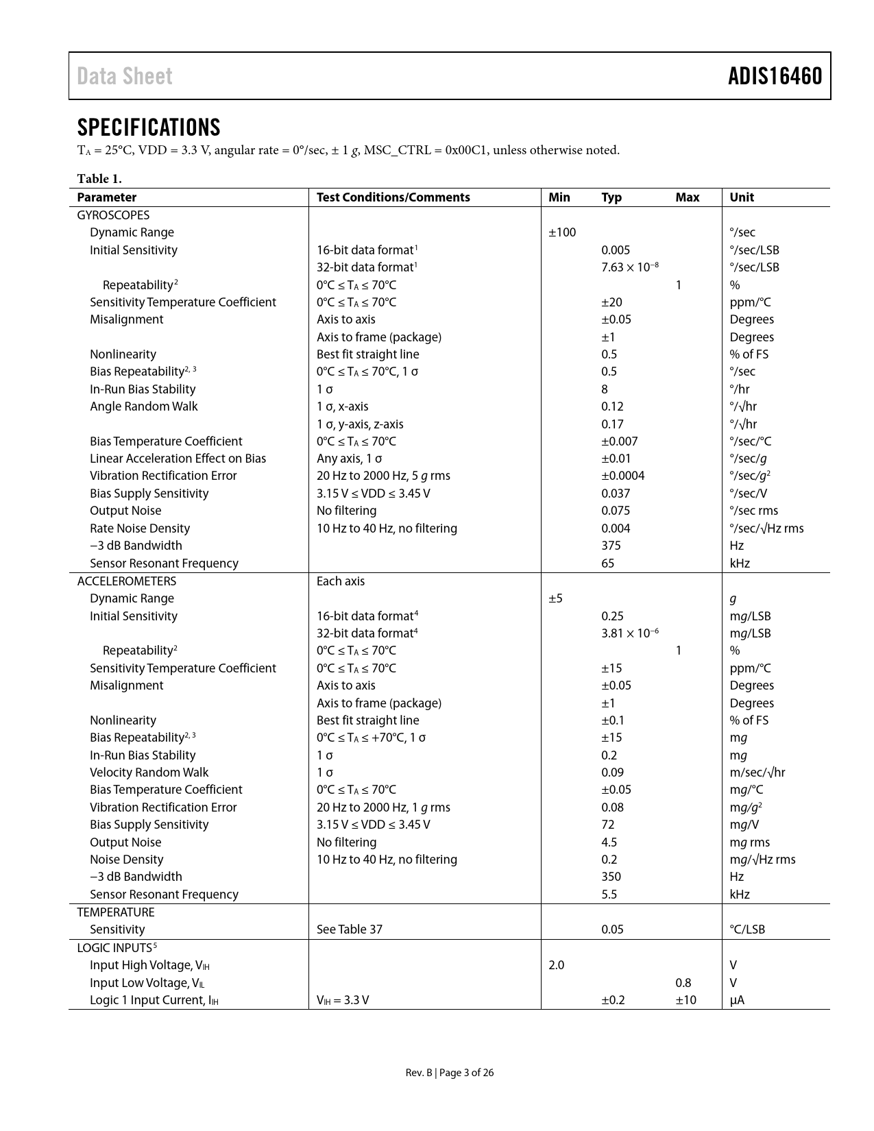 Data Sheet. ADIS16460. SPECIFICATIONS. Table 1. Parameter. Test Conditions/Comments. Min. Typ. Max. Unit
