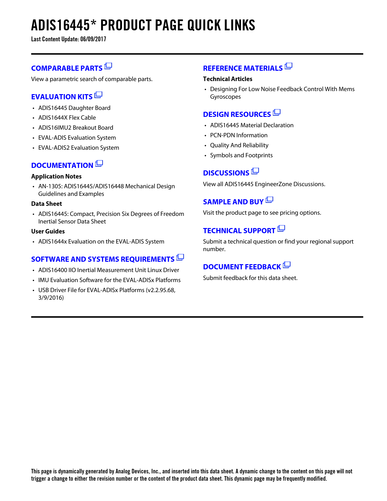 ADIS16445* PRODUCT PAGE QUICK LINKS Last Content Update: 06/09/2017COMPARABLE PARTSREFERENCE MATERIALS View a parametric search of comparable parts. Technical Articles • Designing For Low Noise Feedback Control With Mems EVALUATION KITS Gyroscopes • ADIS16445 Daughter Board • ADIS1644X Flex Cable DESIGN RESOURCES • ADIS16IMU2 Breakout Board • ADIS16445 Material Declaration • EVAL-ADIS Evaluation System • PCN-PDN Information • EVAL-ADIS2 Evaluation System • Quality And Reliability • Symbols and Footprints DOCUMENTATIONApplication NotesDISCUSSIONS • AN-1305: ADIS16445/ADIS16448 Mechanical Design View all ADIS16445 EngineerZone Discussions. Guidelines and Examples Data SheetSAMPLE AND BUY • ADIS16445: Compact, Precision Six Degrees of Freedom Visit the product page to see pricing options. Inertial Sensor Data Sheet User GuidesTECHNICAL SUPPORT • ADIS1644x Evaluation on the EVAL-ADIS System Submit a technical question or find your regional support number. SOFTWARE AND SYSTEMS REQUIREMENTS • ADIS16400 IIO Inertial Measurement Unit Linux Driver DOCUMENT FEEDBACK • IMU Evaluation Software for the EVAL-ADISx Platforms Submit feedback for this data sheet. • USB Driver File for EVAL-ADISx Platforms (v2.2.95.68, 3/9/2016) This page is dynamically generated by Analog Devices, Inc., and inserted into this data sheet. A dynamic change to the content on this page will not trigger a change to either the revision number or the content of the product data sheet. This dynamic page may be frequently modified. Document Outline Features Applications General Description Functional Block Diagram Table of Contents Revision History Specifications Timing Specifications Timing Diagrams Absolute Maximum Ratings ESD Caution Pin Configuration and Function Descriptions Typical Performance Characteristics User Registers User Interface Reading Sensor Data Burst Read Function SPI Read Test Sequence Device Configuration Dual Memory Structure Output Data Registers Gyroscopes Accelerometers Internal Temperature System Functions Global Commands Product Identification Self-Test Function Status/Error Flags Memory Management Checksum Test Input/Output Configuration Data Ready Indicator General-Purpose Input/Output Example Input/Output Configuration Digital Processing Configuration Gyroscopes/Accelerometers Input Clock Configuration Digital Filtering Dynamic Range Calibration Gyroscopes Gyroscope Bias Error Estimation Gyroscope Bias Correction Factors Single Command Bias Correction Accelerometers Accelerometer Bias Error Estimation Accelerometer Bias Correction Factors Point of Percussion Alignment Flash Updates Restoring Factory Calibration Alarms Static Alarm Use Dynamic Alarm Use Alarm Reporting Alarm Example Applications Information Mounting Tips Power Supply Considerations ADIS16445/PCBZ Installation PC-Based Evaluation Tools Outline Dimensions Ordering Guide
