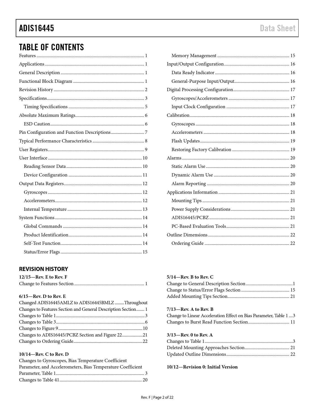 link to page 1 link to page 1 link to page 1 link to page 1 link to page 3 link to page 4 link to page 6 link to page 7 link to page 7 link to page 8 link to page 9 link to page 10 link to page 11 link to page 11 link to page 12 link to page 13 link to page 13 link to page 13 link to page 14 link to page 15 link to page 15 link to page 15 link to page 15 link to page 16 link to page 16 link to page 17 link to page 17 link to page 17 link to page 18 link to page 18 link to page 18 link to page 19 link to page 19 link to page 19 link to page 20 link to page 20 link to page 21 link to page 21 link to page 21 link to page 21 link to page 22 link to page 22 link to page 22 link to page 22 link to page 22 link to page 23 link to page 23 ADIS16445Data SheetTABLE OF CONTENTS Features .. 1 Memory Management ... 15 Applications ... 1 Input/Output Configuration ... 16 General Description ... 1 Data Ready Indicator ... 16 Functional Block Diagram .. 1 General-Purpose Input/Output.. 16 Revision History ... 2 Digital Processing Configuration ... 17 Specifications ... 3 Gyroscopes/Accelerometers ... 17 Timing Specifications .. 5 Input Clock Configuration ... 17 Absolute Maximum Ratings .. 6 Calibration ... 18 ESD Caution .. 6 Gyroscopes .. 18 Pin Configuration and Function Descriptions ... 7 Accelerometers ... 18 Typical Performance Characteristics ... 8 Flash Updates .. 19 User Registers .. 9 Restoring Factory Calibration .. 19 User Interface .. 10 Alarms .. 20 Reading Sensor Data .. 10 Static Alarm Use ... 20 Device Configuration .. 11 Dynamic Alarm Use .. 20 Output Data Registers .. 12 Alarm Reporting .. 20 Gyroscopes .. 12 Applications Information .. 21 Accelerometers .. 12 Mounting Tips .. 21 Internal Temperature ... 13 Power Supply Considerations ... 21 System Functions .. 14 ADIS16445/PCBZ .. 21 Global Commands ... 14 PC-Based Evaluation Tools ... 21 Product Identification .. 14 Outline Dimensions ... 22 Self-Test Function ... 14 Ordering Guide .. 22 Status/Error Flags ... 15 REVISION HISTORY 12/15—Rev. E to Rev. F5/14—Rev. B to Rev. C Change to Features Section ... 1 Change to General Description Section ... 1 Change to Status/Error Flags Section .. 15 6/15—Rev. D to Rev. E Added Mounting Tips Section.. 21 Changed ADIS16445AMLZ to ADIS16445BMLZ . ... ... Throughout Changes to Features Section and General Description Section .. ... 1 7/13—Rev. A to Rev. B Changes to Table 1 .. 3 Change to Linear Acceleration Effect on Bias Parameter, Table 1 . .. 3 Changes to Table 3 .. 6 Changes to Burst Read Function Section .. 11 Changes to Figure 9 .. 10 Changes to ADIS16445/PCBZ Section and Figure 22 ... 21 3/13—Rev. 0 to Rev. A Changes to Ordering Guide .. 22 Changes to Table 1 ... 3 Deleted Mounting Approaches Section ... 21 10/14—Rev. C to Rev. D Updated Outline Dimensions ... 22 Changes to Gyroscopes, Bias Temperature Coefficient Parameter, and Accelerometers, Bias Temperature Coefficient 10/12—Revision 0: Initial Version Parameter, Table 1 ... 3 Changes to Table 41 .. 20 Rev. F | Page 2 of 22 Document Outline Features Applications General Description Functional Block Diagram Table of Contents Revision History Specifications Timing Specifications Timing Diagrams Absolute Maximum Ratings ESD Caution Pin Configuration and Function Descriptions Typical Performance Characteristics User Registers User Interface Reading Sensor Data Burst Read Function SPI Read Test Sequence Device Configuration Dual Memory Structure Output Data Registers Gyroscopes Accelerometers Internal Temperature System Functions Global Commands Product Identification Self-Test Function Status/Error Flags Memory Management Checksum Test Input/Output Configuration Data Ready Indicator General-Purpose Input/Output Example Input/Output Configuration Digital Processing Configuration Gyroscopes/Accelerometers Input Clock Configuration Digital Filtering Dynamic Range Calibration Gyroscopes Gyroscope Bias Error Estimation Gyroscope Bias Correction Factors Single Command Bias Correction Accelerometers Accelerometer Bias Error Estimation Accelerometer Bias Correction Factors Point of Percussion Alignment Flash Updates Restoring Factory Calibration Alarms Static Alarm Use Dynamic Alarm Use Alarm Reporting Alarm Example Applications Information Mounting Tips Power Supply Considerations ADIS16445/PCBZ Installation PC-Based Evaluation Tools Outline Dimensions Ordering Guide