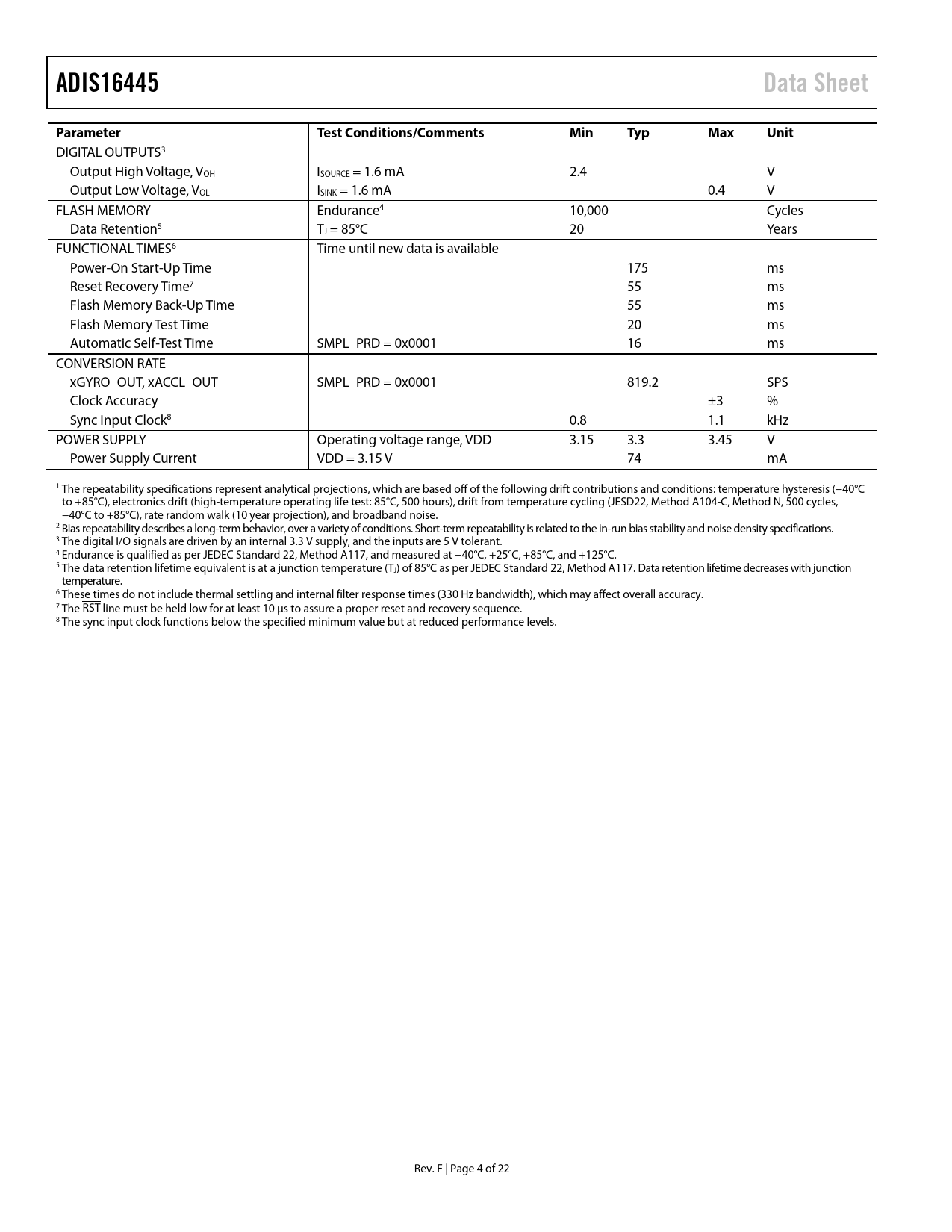 ADIS16445Data SheetParameterTest Conditions/CommentsMinTypMaxUnit DIGITAL OUTPUTS3 Output High Voltage, VOH ISOURCE = 1.6 mA 2.4 V Output Low Voltage, VOL ISINK = 1.6 mA 0.4 V FLASH MEMORY Endurance4 10,000 Cycles Data Retention5 TJ = 85°C 20 Years FUNCTIONAL TIMES6 Time until new data is available Power-On Start-Up Time 175 ms Reset Recovery Time7 55 ms Flash Memory Back-Up Time 55 ms Flash Memory Test Time 20 ms Automatic Self-Test Time SMPL_PRD = 0x0001 16 ms CONVERSION RATE xGYRO_OUT, xACCL_OUT SMPL_PRD = 0x0001 819.2 SPS Clock Accuracy ±3 % Sync Input Clock8 0.8 1.1 kHz POWER SUPPLY Operating voltage range, VDD 3.15 3.3 3.45 V Power Supply Current VDD = 3.15 V 74 mA 1 The repeatability specifications represent analytical projections, which are based off of the following drift contributions and conditions: temperature hysteresis (−40°C to +85°C), electronics drift (high-temperature operating life test: 85°C, 500 hours), drift from temperature cycling (JESD22, Method A104-C, Method N, 500 cycles, −40°C to +85°C), rate random walk (10 year projection), and broadband noise. 2 Bias repeatability describes a long-term behavior, over a variety of conditions. Short-term repeatability is related to the in-run bias stability and noise density specifications. 3 The digital I/O signals are driven by an internal 3.3 V supply, and the inputs are 5 V tolerant. 4 Endurance is qualified as per JEDEC Standard 22, Method A117, and measured at −40°C, +25°C, +85°C, and +125°C. 5 The data retention lifetime equivalent is at a junction temperature (TJ) of 85°C as per JEDEC Standard 22, Method A117. Data retention lifetime decreases with junction temperature. 6 These times do not include thermal settling and internal filter response times (330 Hz bandwidth), which may affect overal accuracy. 7 The RST line must be held low for at least 10 μs to assure a proper reset and recovery sequence. 8 The sync input clock functions below the specified minimum value but at reduced performance levels. Rev. F | Page 4 of 22 Document Outline Features Applications General Description Functional Block Diagram Table of Contents Revision History Specifications Timing Specifications Timing Diagrams Absolute Maximum Ratings ESD Caution Pin Configuration and Function Descriptions Typical Performance Characteristics User Registers User Interface Reading Sensor Data Burst Read Function SPI Read Test Sequence Device Configuration Dual Memory Structure Output Data Registers Gyroscopes Accelerometers Internal Temperature System Functions Global Commands Product Identification Self-Test Function Status/Error Flags Memory Management Checksum Test Input/Output Configuration Data Ready Indicator General-Purpose Input/Output Example Input/Output Configuration Digital Processing Configuration Gyroscopes/Accelerometers Input Clock Configuration Digital Filtering Dynamic Range Calibration Gyroscopes Gyroscope Bias Error Estimation Gyroscope Bias Correction Factors Single Command Bias Correction Accelerometers Accelerometer Bias Error Estimation Accelerometer Bias Correction Factors Point of Percussion Alignment Flash Updates Restoring Factory Calibration Alarms Static Alarm Use Dynamic Alarm Use Alarm Reporting Alarm Example Applications Information Mounting Tips Power Supply Considerations ADIS16445/PCBZ Installation PC-Based Evaluation Tools Outline Dimensions Ordering Guide