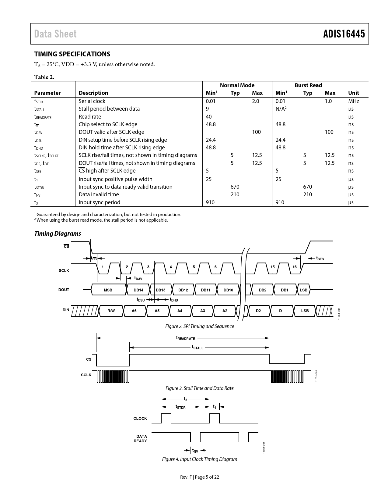 link to page 6 Data SheetADIS16445TIMING SPECIFICATIONS TA = 25°C, VDD = +3.3 V, unless otherwise noted. Table 2.Normal ModeBurst ReadParameterDescriptionMin1TypMaxMin1TypMaxUnit fSCLK Serial clock 0.01 2.0 0.01 1.0 MHz tSTALL Stall period between data 9 N/A2 µs tREADRATE Read rate 40 µs t Chip select to SCLK edge 48.8 48.8 ns CS tDAV DOUT valid after SCLK edge 100 100 ns tDSU DIN setup time before SCLK rising edge 24.4 24.4 ns tDHD DIN hold time after SCLK rising edge 48.8 48.8 ns tSCLKR, tSCLKF SCLK rise/fall times, not shown in timing diagrams 5 12.5 5 12.5 ns tDR, tDF DOUT rise/fal times, not shown in timing diagrams 5 12.5 5 12.5 ns tSFS CS high after SCLK edge 5 5 ns t1 Input sync positive pulse width 25 25 µs tSTDR Input sync to data ready valid transition 670 670 µs tNV Data invalid time 210 210 µs t3 Input sync period 910 910 µs 1 Guaranteed by design and characterization, but not tested in production. 2 When using the burst read mode, the stall period is not applicable. Timing DiagramsCStCStSFS1234561516SCLKtDAVDOUTMSBDB14DB13DB12DB11DB10DB2DB1LSBttDSUDHDDINR/WA6A5A4A3A2D2D1LSB 002 1051- 1 Figure 2. SPI Timing and Sequence tREADRATEtSTALLCSSCLK 003 1051- 1 Figure 3. Stall Time and Data Rate t3ttSTDR1CLOCKDATAREADY 004 tNV 1051- 1 Figure 4. Input Clock Timing Diagram Rev. F | Page 5 of 22 Document Outline Features Applications General Description Functional Block Diagram Table of Contents Revision History Specifications Timing Specifications Timing Diagrams Absolute Maximum Ratings ESD Caution Pin Configuration and Function Descriptions Typical Performance Characteristics User Registers User Interface Reading Sensor Data Burst Read Function SPI Read Test Sequence Device Configuration Dual Memory Structure Output Data Registers Gyroscopes Accelerometers Internal Temperature System Functions Global Commands Product Identification Self-Test Function Status/Error Flags Memory Management Checksum Test Input/Output Configuration Data Ready Indicator General-Purpose Input/Output Example Input/Output Configuration Digital Processing Configuration Gyroscopes/Accelerometers Input Clock Configuration Digital Filtering Dynamic Range Calibration Gyroscopes Gyroscope Bias Error Estimation Gyroscope Bias Correction Factors Single Command Bias Correction Accelerometers Accelerometer Bias Error Estimation Accelerometer Bias Correction Factors Point of Percussion Alignment Flash Updates Restoring Factory Calibration Alarms Static Alarm Use Dynamic Alarm Use Alarm Reporting Alarm Example Applications Information Mounting Tips Power Supply Considerations ADIS16445/PCBZ Installation PC-Based Evaluation Tools Outline Dimensions Ordering Guide