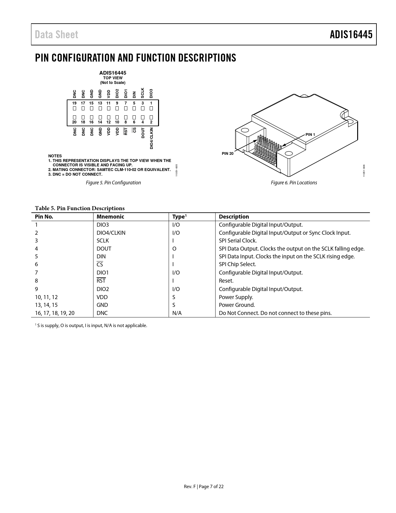 Data SheetADIS16445PIN CONFIGURATION AND FUNCTION DESCRIPTIONSADIS16445TOP VIEW(Not to Scale)KNDNDDDIO2NIO1CLIO3DNCDNCGGVDDDISD1917151311975312018161412108642TINNDDDDDCSUTDNCDNCDNCGVVRSLKPIN 1DO/CIO4 DPIN 20NOTES 1. THIS REPRESENTATION DISPLAYS THE TOP VIEW WHEN THE CONNECTOR IS VISIBLE AND FACING UP. 005 006 2. MATING CONNECTOR: SAMTEC CLM-110-02 OR EQUIVALENT. 3. DNC = DO NOT CONNECT. 1051- 1 1051- 1 Figure 5. Pin Configuration Figure 6. Pin Locations Table 5. Pin Function Descriptions Pin No.MnemonicType1Description 1 DIO3 I/O Configurable Digital Input/Output. 2 DIO4/CLKIN I/O Configurable Digital Input/Output or Sync Clock Input. 3 SCLK I SPI Serial Clock. 4 DOUT O SPI Data Output. Clocks the output on the SCLK falling edge. 5 DIN I SPI Data Input. Clocks the input on the SCLK rising edge. 6 CS I SPI Chip Select. 7 DIO1 I/O Configurable Digital Input/Output. 8 RST I Reset. 9 DIO2 I/O Configurable Digital Input/Output. 10, 11, 12 VDD S Power Supply. 13, 14, 15 GND S Power Ground. 16, 17, 18, 19, 20 DNC N/A Do Not Connect. Do not connect to these pins. 1 S is supply, O is output, I is input, N/A is not applicable. Rev. F | Page 7 of 22 Document Outline Features Applications General Description Functional Block Diagram Table of Contents Revision History Specifications Timing Specifications Timing Diagrams Absolute Maximum Ratings ESD Caution Pin Configuration and Function Descriptions Typical Performance Characteristics User Registers User Interface Reading Sensor Data Burst Read Function SPI Read Test Sequence Device Configuration Dual Memory Structure Output Data Registers Gyroscopes Accelerometers Internal Temperature System Functions Global Commands Product Identification Self-Test Function Status/Error Flags Memory Management Checksum Test Input/Output Configuration Data Ready Indicator General-Purpose Input/Output Example Input/Output Configuration Digital Processing Configuration Gyroscopes/Accelerometers Input Clock Configuration Digital Filtering Dynamic Range Calibration Gyroscopes Gyroscope Bias Error Estimation Gyroscope Bias Correction Factors Single Command Bias Correction Accelerometers Accelerometer Bias Error Estimation Accelerometer Bias Correction Factors Point of Percussion Alignment Flash Updates Restoring Factory Calibration Alarms Static Alarm Use Dynamic Alarm Use Alarm Reporting Alarm Example Applications Information Mounting Tips Power Supply Considerations ADIS16445/PCBZ Installation PC-Based Evaluation Tools Outline Dimensions Ordering Guide