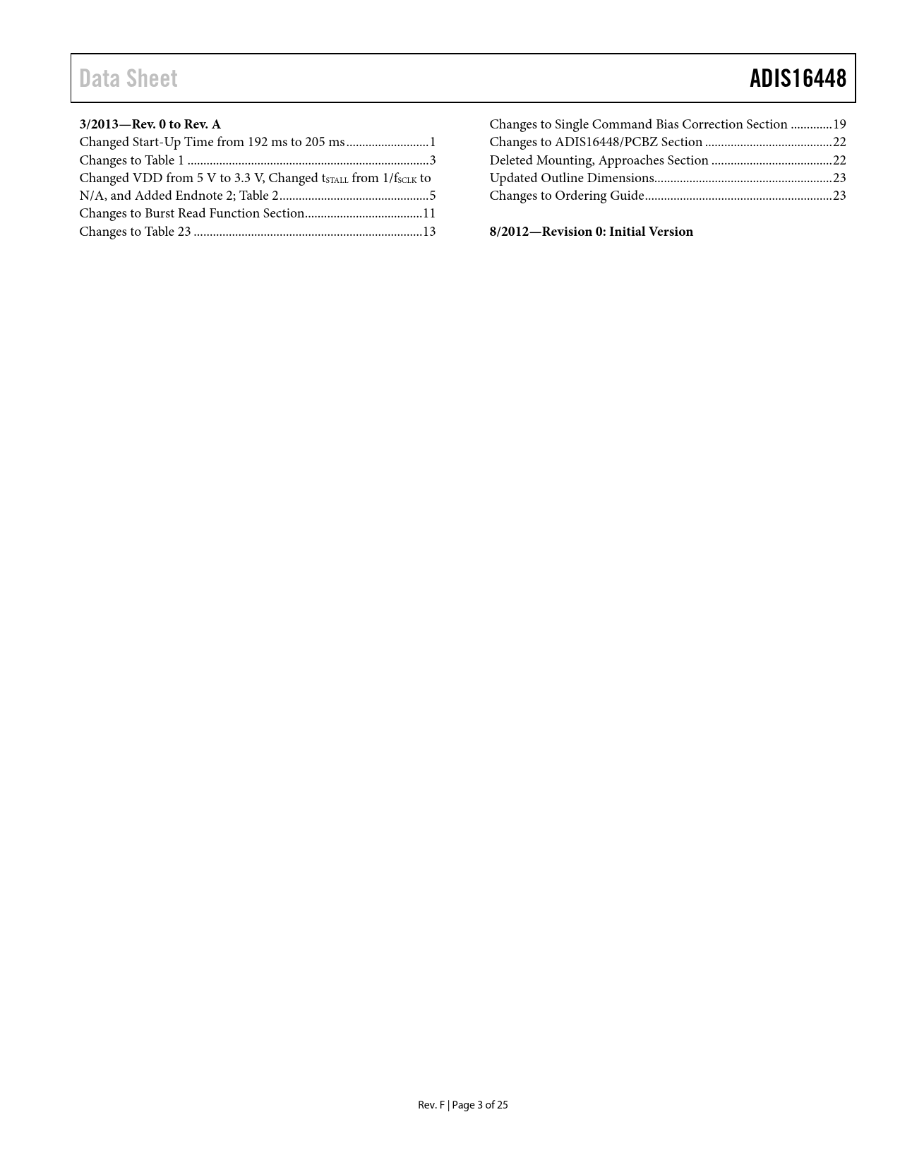 Data Sheet ADIS16448 3/2013—Rev 0 to Rev A 8/2012—Revision 0: Initial Version