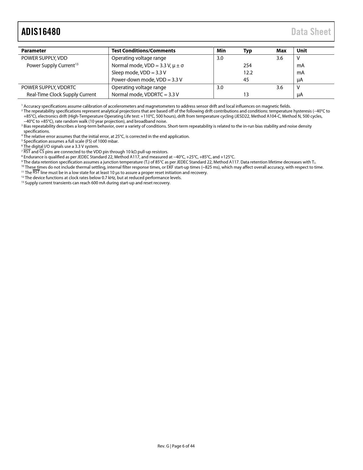 ADIS16480Data SheetParameterTest Conditions/CommentsMinTypMaxUnit POWER SUPPLY, VDD Operating voltage range 3.0 3.6 V Power Supply Current13 Normal mode, VDD = 3.3 V, µ ± σ 254 mA Sleep mode, VDD = 3.3 V 12.2 mA Power-down mode, VDD = 3.3 V 45 µA POWER SUPPLY, VDDRTC Operating voltage range 3.0 3.6 V Real-Time Clock Supply Current Normal mode, VDDRTC = 3.3 V 13 µA 1 Accuracy specifications assume calibration of accelerometers and magnetometers to address sensor drift and local influences on magnetic fields. 2 The repeatability specifications represent analytical projections that are based off of the following drift contributions and conditions: temperature hysteresis (−40°C to +85°C), electronics drift (High-Temperature Operating Life test: +110°C, 500 hours), drift from temperature cycling (JESD22, Method A104-C, Method N, 500 cycles, −40°C to +85°C), rate random walk (10 year projection), and broadband noise. 3 Bias repeatability describes a long-term behavior, over a variety of conditions. Short-term repeatability is related to the in-run bias stability and noise density specifications. 4 The relative error assumes that the initial error, at 25°C, is corrected in the end application. 5 Specification assumes a full scale (FS) of 1000 mbar. 6 The digital I/O signals use a 3.3 V system. 7 RST and CS pins are connected to the VDD pin through 10 kΩ pull-up resistors. 8 Endurance is qualified as per JEDEC Standard 22, Method A117, and measured at −40°C, +25°C, +85°C, and +125°C. 9 The data retention specification assumes a junction temperature (TJ) of 85°C as per JEDEC Standard 22, Method A117. Data retention lifetime decreases with TJ. 10 These times do not include thermal settling, internal filter response times, or EKF start-up times (~825 ms), which may affect overall accuracy, with respect to time. 11 The RST line must be in a low state for at least 10 μs to assure a proper reset initiation and recovery. 12 The device functions at clock rates below 0.7 kHz, but at reduced performance levels. 13 Supply current transients can reach 600 mA during start-up and reset recovery. Rev. G | Page 6 of 44 Document Outline Features Applications General Description Functional Block Diagram Revision History Specifications Timing Specifications Timing Diagrams Absolute Maximum Ratings ESD Caution Pin Configuration and Function Descriptions Typical Performance Characteristics Basic Operation Register Structure SPI Communication Device Configuration Dual Memory Structure Reading Sensor Data User Registers Output Data Registers Inertial Sensor Data Format Rotation Rate (Gyroscope) Acceleration Delta Angles Delta Velocity Magnetometers Roll, Pitch, Yaw Angles Initial Conditions Quaternion Euler Angles Rotation Matrix Data Barometer Internal Temperature Status/Alarm Indicators Firmware Revision Product Identification Digital Signal Processing Gyroscopes/Accelerometers Averaging/Decimation Filter Magnetometer/Barometer FIR Filter Banks Filter Memory Organization Default Filter Performance Extended Kalman Filter Algorithm Covariance Terms Reference Frame Reference Transformation Matrix Declination Adaptive Operation Adaptive EKF Enable Bit Automatic EKF Divergence Reset Control Bit Gyroscope Fade Control Bit Body Frame/Local Navigation Frame Bit Orientation Format Control Bit Magnetometer Disable Control Bit Gravity Removal Control Bit Linear Acceleration/Magnetic Disturbance Detection Calibration Gyroscopes Manual Bias Correction Manual Sensitivity Correction Linear Acceleration on Effect on Gyroscope Bias Accelerometers Manual Bias Correction Manual Sensitivity Correction Magnetometers Hard Iron Correction Soft Iron Correction Matrix Barometers Restoring Factory Calibration Point of Percussion Alignment Alarms Static Alarm Use Dynamic Alarm Use Alarm Example System Controls Global Commands Software Reset Automatic Self-Test Memory Management Flash Memory Test General-Purpose I/O Data-Ready Indicator Input Sync/Clock Control General-Purpose I/O Control Power Management General-Purpose Registers Real-Time Clock Configuration/Data Applications Information Mounting Tips Evaluation Tools Breakout Board, ADIS16IMU1/PCB PC-Based Evaluation, EVAL-ADIS2 Power Supply Considerations Outline Dimensions Ordering Guide