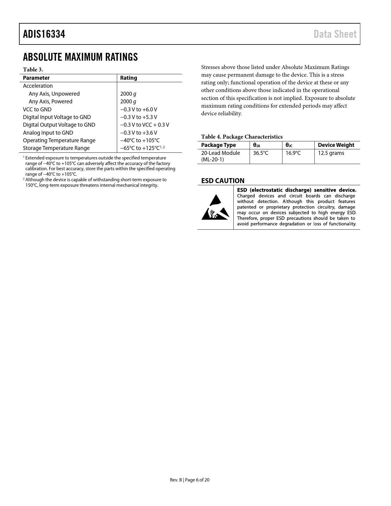 ADIS16334. Data Sheet. ABSOLUTE MAXIMUM RATINGS Table 3. Parameter. Rating. Table 4. Package Characteristics. Package Type. θJC