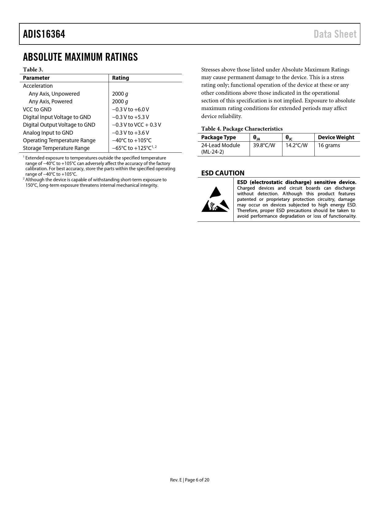 ADIS16364 Data Sheet ABSOLUTE MAXIMUM RATINGS Table 3 Parameter Rating Table 4 Package Characteristics Package Type