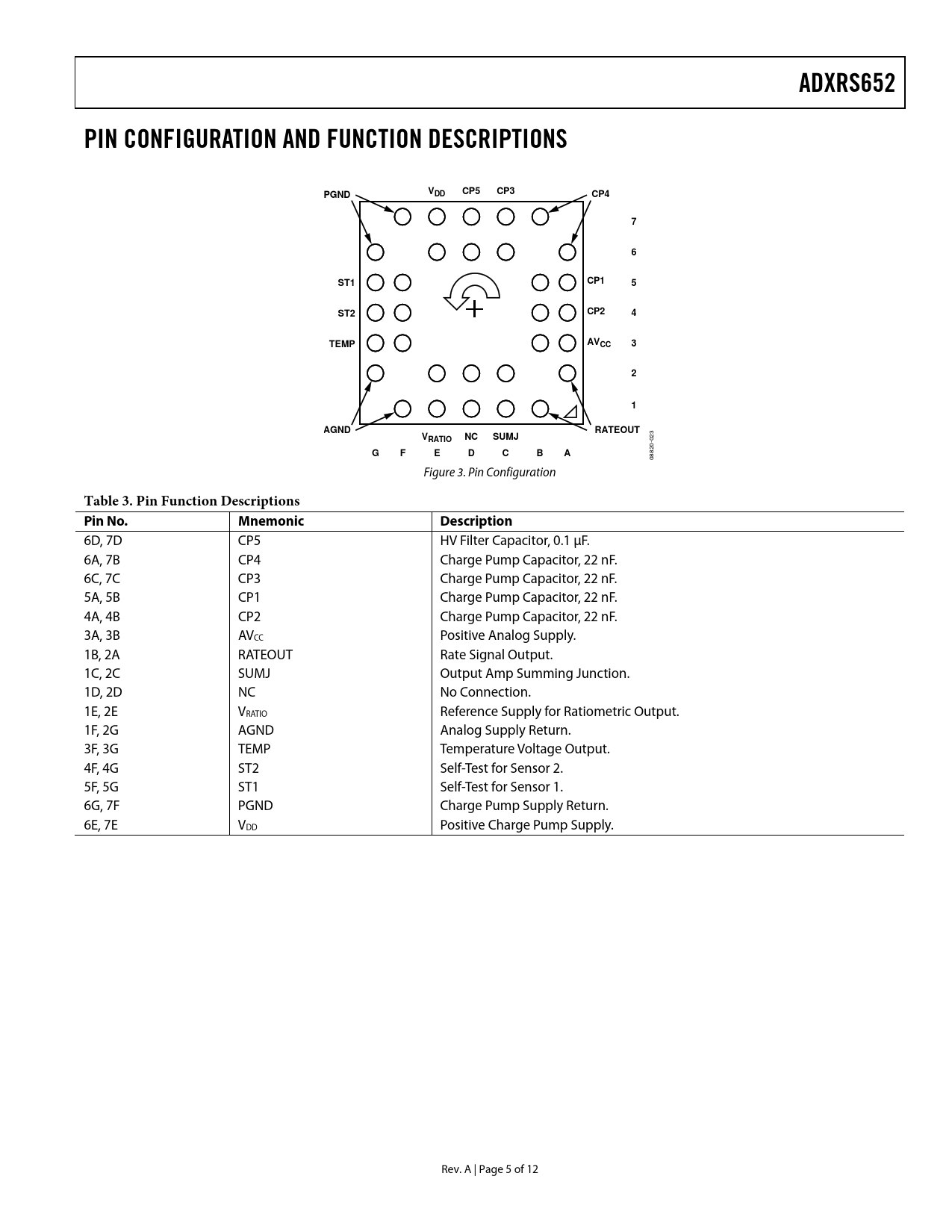 6D, 7D CP5 HV Filter Capacitor, 0.1 μF. 6A, 7B CP4 Charge Pump Capacitor, 22 nF. 6C, 7C CP3 Charge Pump Capacitor, 22 nF. 5A, 5B CP1 Charge Pump Capacitor, 22 nF. 4A, 4B CP2 Charge Pump Capacitor, 22 nF. 3A, 3B AVCC Positive Analog Supply. 1B, 2A RATEOUT Rate Signal Output. 1C, 2C SUMJ Output Amp Summing Junction. 1D, 2D NC No Connection. 1E, 2E VRATIO Reference Supply for Ratiometric Output. 1F, 2G AGND Analog Supply Return. 3F, 3G TEMP Temperature Voltage Output. 4F, 4G ST2 Self-Test for Sensor 2. 5F, 5G ST1 Self-Test for Sensor 1. 6G, 7F PGND Charge Pump Supply Return. 6E, 7E VDD Positive Charge Pump Supply. Rev. A | Page 5 of 12 Document Outline FEATURES APPLICATIONS GENERAL DESCRIPTION FUNCTIONAL BLOCK DIAGRAM TABLE OF CONTENTS REVISION HISTORY SPECIFICATIONS ABSOLUTE MAXIMUM RATINGS RATE SENSITIVE AXIS ESD CAUTION PIN CONFIGURATION AND FUNCTION DESCRIPTIONS TYPICAL PERFORMANCE CHARACTERISTICS THEORY OF OPERATION SETTING BANDWIDTH TEMPERATURE OUTPUT AND CALIBRATION MODIFYING THE ADXRS652 SCALE TO MATCH THE ADXRS620 CALIBRATED PERFORMANCE ADXRS652 AND SUPPLY RATIOMETRICITY NULL ADJUSTMENT SELF-TEST FUNCTION CONTINUOUS SELF-TEST OUTLINE DIMENSIONS ORDERING GUIDE
