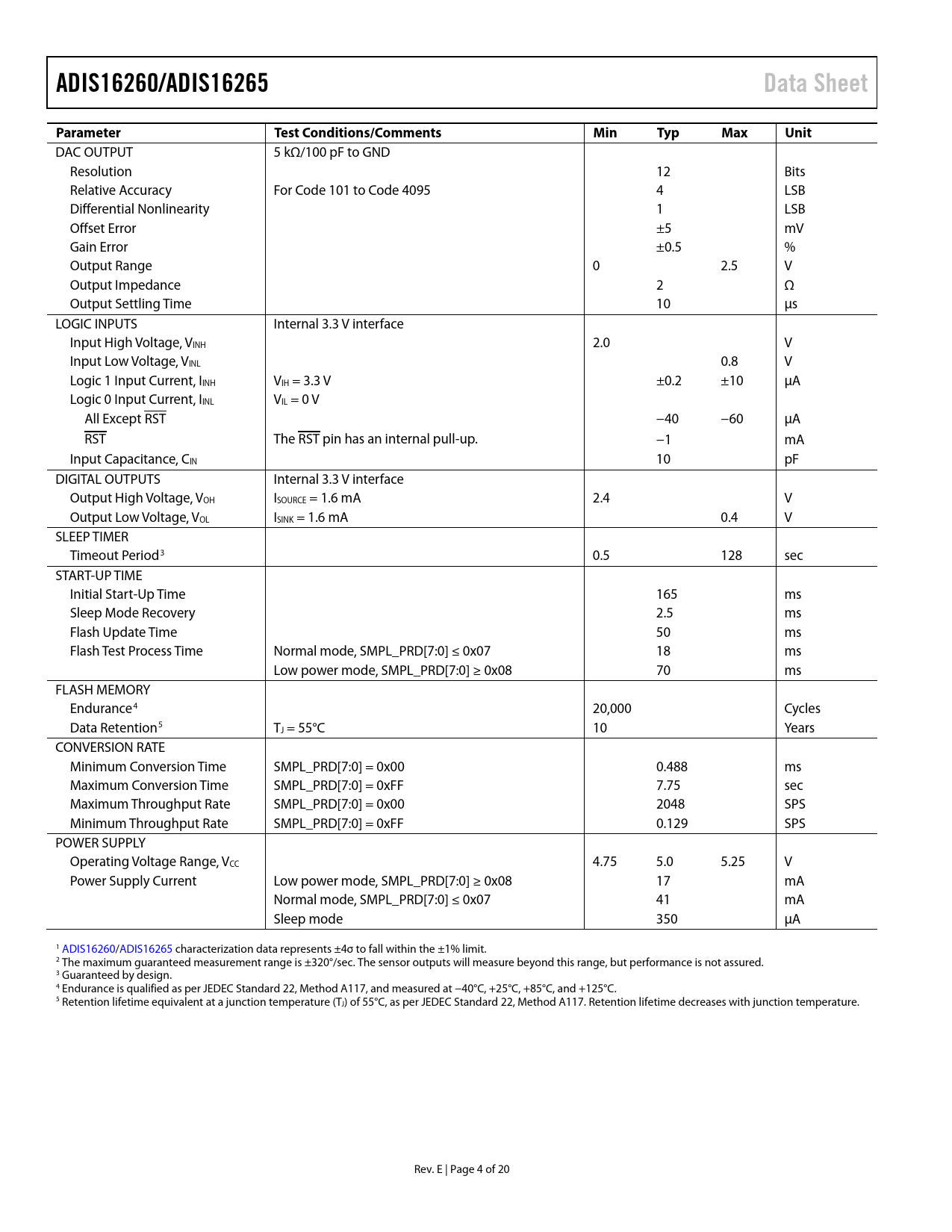 link to page 4 link to page 4 link to page 4 ADIS16260/ADIS16265Data SheetParameterTest Conditions/CommentsMinTypMaxUnit DAC OUTPUT 5 kΩ/100 pF to GND Resolution 12 Bits Relative Accuracy For Code 101 to Code 4095 4 LSB Differential Nonlinearity 1 LSB Offset Error ±5 mV Gain Error ±0.5 % Output Range 0 2.5 V Output Impedance 2 Ω Output Settling Time 10 µs LOGIC INPUTS Internal 3.3 V interface Input High Voltage, VINH 2.0 V Input Low Voltage, VINL 0.8 V Logic 1 Input Current, IINH VIH = 3.3 V ±0.2 ±10 µA Logic 0 Input Current, IINL VIL = 0 V All Except RST −40 −60 µA RST The RST pin has an internal pull-up. −1 mA Input Capacitance, CIN 10 pF DIGITAL OUTPUTS Internal 3.3 V interface Output High Voltage, VOH ISOURCE = 1.6 mA 2.4 V Output Low Voltage, VOL ISINK = 1.6 mA 0.4 V SLEEP TIMER Timeout Period3 0.5 128 sec START-UP TIME Initial Start-Up Time 165 ms Sleep Mode Recovery 2.5 ms Flash Update Time 50 ms Flash Test Process Time Normal mode, SMPL_PRD[7:0] ≤ 0x07 18 ms Low power mode, SMPL_PRD[7:0] ≥ 0x08 70 ms FLASH MEMORY Endurance4 20,000 Cycles Data Retention5 TJ = 55°C 10 Years CONVERSION RATE Minimum Conversion Time SMPL_PRD[7:0] = 0x00 0.488 ms Maximum Conversion Time SMPL_PRD[7:0] = 0xFF 7.75 sec Maximum Throughput Rate SMPL_PRD[7:0] = 0x00 2048 SPS Minimum Throughput Rate SMPL_PRD[7:0] = 0xFF 0.129 SPS POWER SUPPLY Operating Voltage Range, VCC 4.75 5.0 5.25 V Power Supply Current Low power mode, SMPL_PRD[7:0] ≥ 0x08 17 mA Normal mode, SMPL_PRD[7:0] ≤ 0x07 41 mA Sleep mode 350 µA 1 ADIS16260/ADIS16265 characterization data represents ±4σ to fall within the ±1% limit. 2 The maximum guaranteed measurement range is ±320°/sec. The sensor outputs will measure beyond this range, but performance is not assured. 3 Guaranteed by design. 4 Endurance is qualified as per JEDEC Standard 22, Method A117, and measured at −40°C, +25°C, +85°C, and +125°C. 5 Retention lifetime equivalent at a junction temperature (TJ) of 55°C, as per JEDEC Standard 22, Method A117. Retention lifetime decreases with junction temperature. Rev. E | Page 4 of 20 Document Outline Features Applications General Description Functional Block Diagram Table of Contents Revision History Specifications Timing Specifications Timing Diagrams Absolute Maximum Ratings ESD Caution Pin Configuration and Function Descriptions Typical Performance Characteristics Theory of Operation Sensing Element Data Sampling and Processing User Interface SPI Interface User Registers Basic Operation SPI Write Commands SPI Read Commands Memory Map Processing Sensor Data Operational Controls Internal Sample Rate Sensor Bandwidth Digital Filtering Dynamic Range Calibration Global Commands Power Management Input/Output Functions General-Purpose I/O Data Ready I/O Indicator Auxiliary DAC Diagnostics Self-Test Memory Test Status Alarm Registers Product Identification Applications Information Assembly Bias Optimization Interface Printed Circuit Board (PCB) Outline Dimensions Ordering Guide