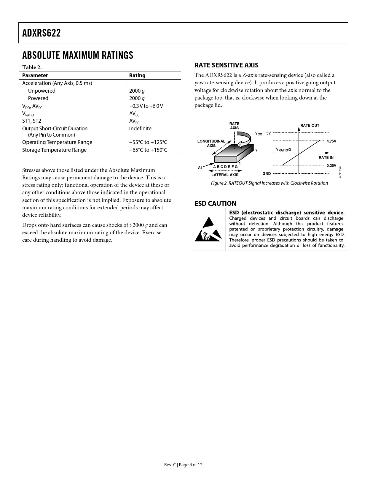 ADXRS622. ABSOLUTE MAXIMUM RATINGS Table 2. RATE SENSITIVE AXIS. Parameter. Rating. RATE. RATE OUT. AXIS. VCC = 5V. LONGITUDINAL. 4.75V