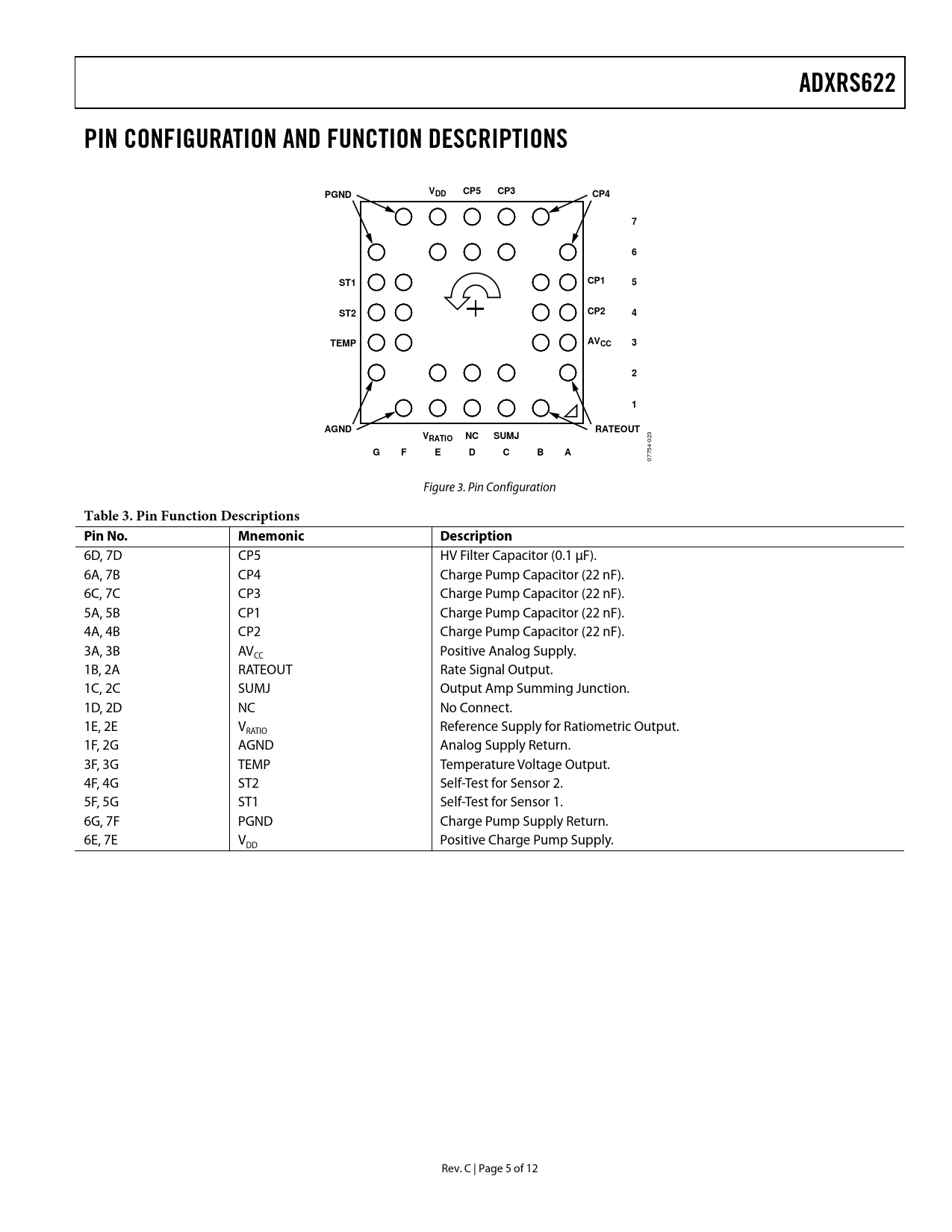 6D, 7D CP5 HV Filter Capacitor (0.1 µF). 6A, 7B CP4 Charge Pump Capacitor (22 nF). 6C, 7C CP3 Charge Pump Capacitor (22 nF). 5A, 5B CP1 Charge Pump Capacitor (22 nF). 4A, 4B CP2 Charge Pump Capacitor (22 nF). 3A, 3B AV Positive Analog Supply. CC 1B, 2A RATEOUT Rate Signal Output. 1C, 2C SUMJ Output Amp Summing Junction. 1D, 2D NC No Connect. 1E, 2E V Reference Supply for Ratiometric Output. RATIO 1F, 2G AGND Analog Supply Return. 3F, 3G TEMP Temperature Voltage Output. 4F, 4G ST2 Self-Test for Sensor 2. 5F, 5G ST1 Self-Test for Sensor 1. 6G, 7F PGND Charge Pump Supply Return. 6E, 7E V Positive Charge Pump Supply. DD Rev. C | Page 5 of 12 Document Outline Features Applications General Description Functional Block Diagram Revision History Specifications Absolute Maximum Ratings Rate Sensitive Axis ESD Caution Pin Configuration and Function Descriptions Typical Performance Characteristics Theory of Operation Setting Bandwidth Temperature Output and Calibration Calibrated Performance ADXRS622 and Supply Ratiometricity Null Adjustment Self-Test Function Continuous Self-Test Outline Dimensions Ordering Guide Automotive Products
