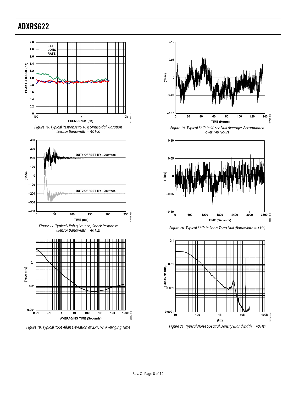 ADXRS6222.00.10LAT1.8LONG RATE1.60.051.4°/s) ( 1.2UT O E 1.00(°/sec)0.8AK RAT E P 0.6–0.050.40.20–0.101001k10k 116 020406080100120140 018 FREQUENCY (Hz) 07754- TIME (Hours) 07754- Figure 16. Typical Response to 10 g Sinusoidal Vibration Figure 19. Typical Shift in 90 sec Null Averages Accumulated (Sensor Bandwidth = 40 Hz) over 140 Hours 4000.10300DUT1 OFFSET BY +200°/sec2000.0510000(°/sec)(°/sec)–100DUT2 OFFSET BY –200°/sec–200–0.05–300–400–0.10050100150200250 016 060012001800240030003600 019 TIME (ms) 07754- TIME (Seconds) 07754- Figure 17. Typical High g (2500 g) Shock Response Figure 20. Typical Shift in Short Term Null (Bandwidth = 1 Hz) (Sensor Bandwidth = 40 Hz) 10.10.10.01rms)Hz(°/sec rms)0.01(°/sec/ 0.0010.0010.010.11101001k10k100k0.0001 017 101001k10k100k 020 AVERAGING TIME (Seconds) 07754- (Hz) 07754- Figure 18. Typical Root Allan Deviation at 25°C vs. Averaging Time Figure 21. Typical Noise Spectral Density (Bandwidth = 40 Hz) Rev. C | Page 8 of 12 Document Outline Features Applications General Description Functional Block Diagram Revision History Specifications Absolute Maximum Ratings Rate Sensitive Axis ESD Caution Pin Configuration and Function Descriptions Typical Performance Characteristics Theory of Operation Setting Bandwidth Temperature Output and Calibration Calibrated Performance ADXRS622 and Supply Ratiometricity Null Adjustment Self-Test Function Continuous Self-Test Outline Dimensions Ordering Guide Automotive Products
