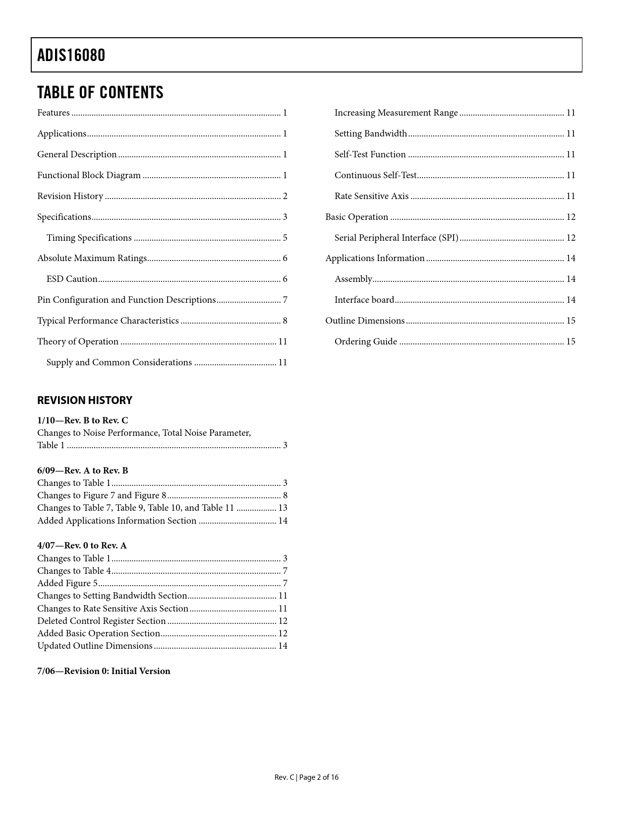 link to page 1 link to page 1 link to page 1 link to page 1 link to page 3 link to page 4 link to page 6 link to page 7 link to page 7 link to page 8 link to page 9 link to page 12 link to page 12 link to page 12 link to page 12 link to page 12 link to page 12 link to page 12 link to page 13 link to page 13 link to page 15 link to page 15 link to page 15 link to page 16 link to page 16 ADIS16080TABLE OF CONTENTS Features .. 1 Increasing Measurement Range ... 11 Applications ... 1 Setting Bandwidth .. 11 General Description ... 1 Self-Test Function .. 11 Functional Block Diagram .. 1 Continuous Self-Test .. 11 Revision History ... 2 Rate Sensitive Axis ... 11 Specifications ... 3 Basic Operation .. 12 Timing Specifications .. 5 Serial Peripheral Interface (SPI) ... 12 Absolute Maximum Ratings .. 6 Applications Information .. 14 ESD Caution .. 6 Assembly .. 14 Pin Configuration and Function Descriptions ... 7 Interface board .. 14 Typical Performance Characteristics ... 8 Outline Dimensions ... 15 Theory of Operation .. 11 Ordering Guide .. 15 Supply and Common Considerations ... 11 REVISION HISTORY1/10—Rev. B to Rev. C Changes to Noise Performance, Total Noise Parameter, Table 1 .. 3 6/09—Rev. A to Rev. B Changes to Table 1 .. 3 Changes to Figure 7 and Figure 8 ... 8 Changes to Table 7, Table 9, Table 10, and Table 11 .. 13 Added Applications Information Section ... 14 4/07—Rev. 0 to Rev. A Changes to Table 1 .. 3 Changes to Table 4 .. 7 Added Figure 5 .. 7 Changes to Setting Bandwidth Section .. 11 Changes to Rate Sensitive Axis Section ... 11 Deleted Control Register Section ... 12 Added Basic Operation Section .. 12 Updated Outline Dimensions ... 14 7/06—Revision 0: Initial Version Rev. C | Page 2 of 16 Document Outline FEATURES APPLICATIONS GENERAL DESCRIPTION FUNCTIONAL BLOCK DIAGRAM TABLE OF CONTENTS REVISION HISTORY SPECIFICATIONS TIMING SPECIFICATIONS ABSOLUTE MAXIMUM RATINGS ESD CAUTION PIN CONFIGURATION AND FUNCTION DESCRIPTIONS TYPICAL PERFORMANCE CHARACTERISTICS THEORY OF OPERATION SUPPLY AND COMMON CONSIDERATIONS INCREASING MEASUREMENT RANGE SETTING BANDWIDTH SELF-TEST FUNCTION CONTINUOUS SELF-TEST RATE SENSITIVE AXIS BASIC OPERATION SERIAL PERIPHERAL INTERFACE (SPI) Control Register ADC Conversion Output Data Access Output Coding Examples APPLICATIONS INFORMATION ASSEMBLY INTERFACE BOARD OUTLINE DIMENSIONS ORDERING GUIDE