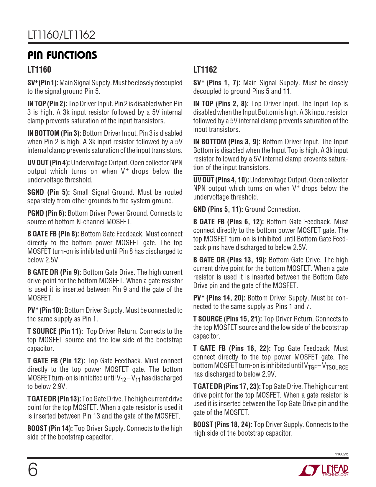 LT1160/LT1162 UUUPIN FUNCTIONSLT1160LT1162SV+ (Pin 1): Main Signal Supply. Must be closely decoupled SV+ (Pins 1, 7): Main Signal Supply. Must be closely to the signal ground Pin 5. decoupled to ground Pins 5 and 11. IN TOP (Pin 2): Top Driver Input. Pin 2 is disabled when Pin IN TOP (Pins 2, 8): Top Driver Input. The Input Top is 3 is high. A 3k input resistor followed by a 5V internal disabled when the Input Bottom is high. A 3k input resistor clamp prevents saturation of the input transistors. followed by a 5V internal clamp prevents saturation of the input transistors. IN BOTTOM (Pin 3): Bottom Driver Input. Pin 3 is disabled when Pin 2 is high. A 3k input resistor followed by a 5V IN BOTTOM (Pins 3, 9): Bottom Driver Input. The Input internal clamp prevents saturation of the input transistors. Bottom is disabled when the Input Top is high. A 3k input resistor followed by a 5V internal clamp prevents satura- UV OUT (Pin 4): Undervoltage Output. Open collector NPN tion of the input transistors. output which turns on when V + drops below the undervoltage threshold. UV OUT (Pins 4, 10): Undervoltage Output. Open collector NPN output which turns on when V+ drops below the SGND (Pin 5): Small Signal Ground. Must be routed undervoltage threshold. separately from other grounds to the system ground. GND (Pins 5, 11): Ground Connection. PGND (Pin 6): Bottom Driver Power Ground. Connects to source of bottom N-channel MOSFET. B GATE FB (Pins 6, 12): Bottom Gate Feedback. Must connect directly to the bottom power MOSFET gate. The B GATE FB (Pin 8): Bottom Gate Feedback. Must connect top MOSFET turn-on is inhibited until Bottom Gate Feed- directly to the bottom power MOSFET gate. The top back pins have discharged to below 2.5V. MOSFET turn-on is inhibited until Pin 8 has discharged to below 2.5V. B GATE DR (Pins 13, 19): Bottom Gate Drive. The high current drive point for the bottom MOSFET. When a gate B GATE DR (Pin 9): Bottom Gate Drive. The high current resistor is used it is inserted between the Bottom Gate drive point for the bottom MOSFET. When a gate resistor Drive pin and the gate of the MOSFET. is used it is inserted between Pin 9 and the gate of the MOSFET. PV+ (Pins 14, 20): Bottom Driver Supply. Must be con- nected to the same supply as Pins 1 and 7. PV+ (Pin 10): Bottom Driver Supply. Must be connected to the same supply as Pin 1. T SOURCE (Pins 15, 21): Top Driver Return. Connects to the top MOSFET source and the low side of the bootstrap T SOURCE (Pin 11): Top Driver Return. Connects to the capacitor. top MOSFET source and the low side of the bootstrap capacitor. T GATE FB (Pins 16, 22): Top Gate Feedback. Must connect directly to the top power MOSFET gate. The T GATE FB (Pin 12): Top Gate Feedback. Must connect bottom MOSFET turn-on is inhibited until VTGF – VTSOURCE directly to the top power MOSFET gate. The bottom has discharged to below 2.9V. MOSFET turn-on is inhibited until V12 – V11 has discharged to below 2.9V. T GATE DR (Pins 17, 23): Top Gate Drive. The high current drive point for the top MOSFET. When a gate resistor is T GATE DR (Pin 13): Top Gate Drive. The high current drive used it is inserted between the Top Gate Drive pin and the point for the top MOSFET. When a gate resistor is used it gate of the MOSFET. is inserted between Pin 13 and the gate of the MOSFET. BOOST (Pins 18, 24): Top Driver Supply. Connects to the BOOST (Pin 14): Top Driver Supply. Connects to the high high side of the bootstrap capacitor. side of the bootstrap capacitor. 11602fb 6