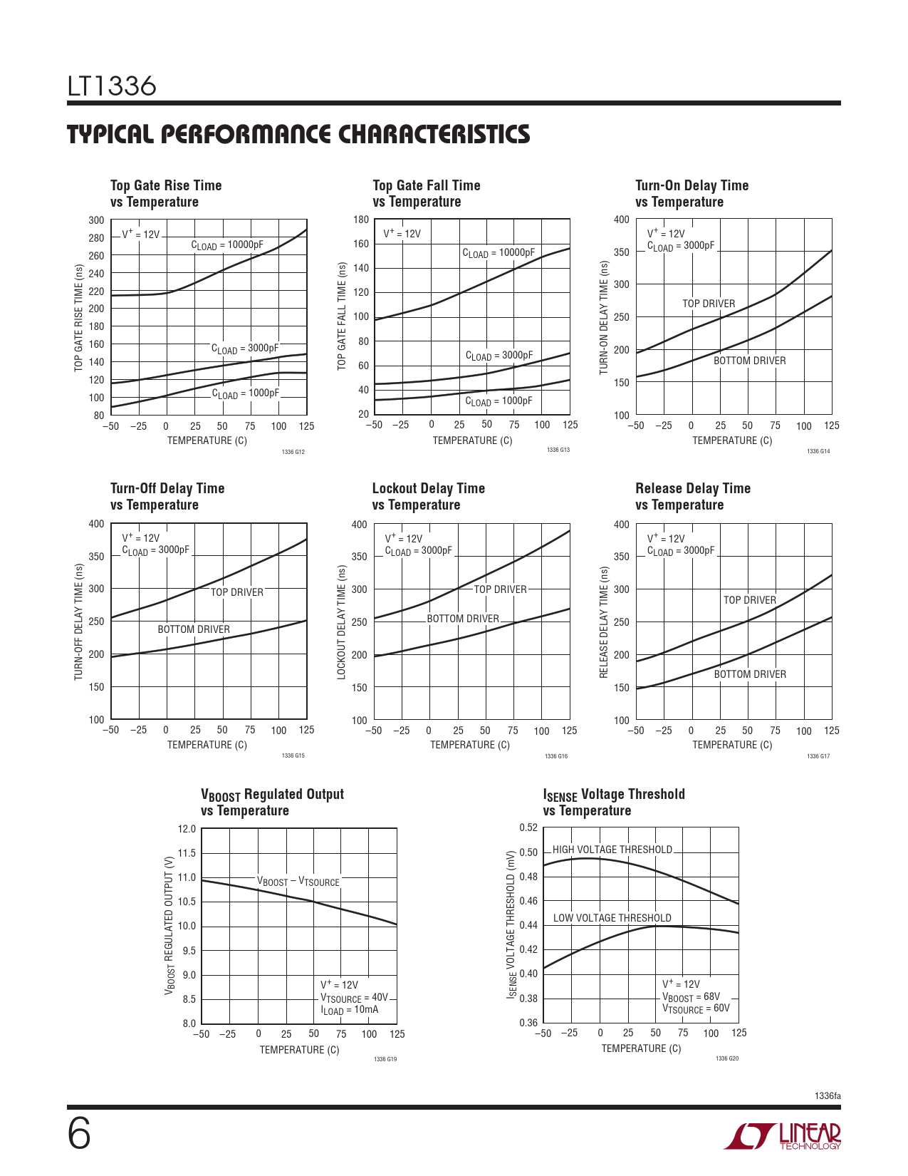 300 180 400 280 V+ = 12V V+ = 12V V+ = 12V CLOAD = 10000pF 160 CLOAD = 3000pF 260 CLOAD = 10000pF 350 240 140 300 220 120 200 TOP DRIVER 100 250 180 160 80 CLOAD = 3000pF C 200 LOAD = 3000pF BOTTOM DRIVER TOP GATE RISE TIME (ns) 140 TOP GATE FALL TIME (ns) 60 TURN-ON DELAY TIME (ns) 120 150 40 100 CLOAD = 1000pF CLOAD = 1000pF 80 20 100 –50 –25 0 25 50 75 100 125 –50 –25 0 25 50 75 100 125 –50 –25 0 25 50 75 100 125 TEMPERATURE (C) TEMPERATURE (C) TEMPERATURE (C) 1336 G12 1336 G13 1336 G14