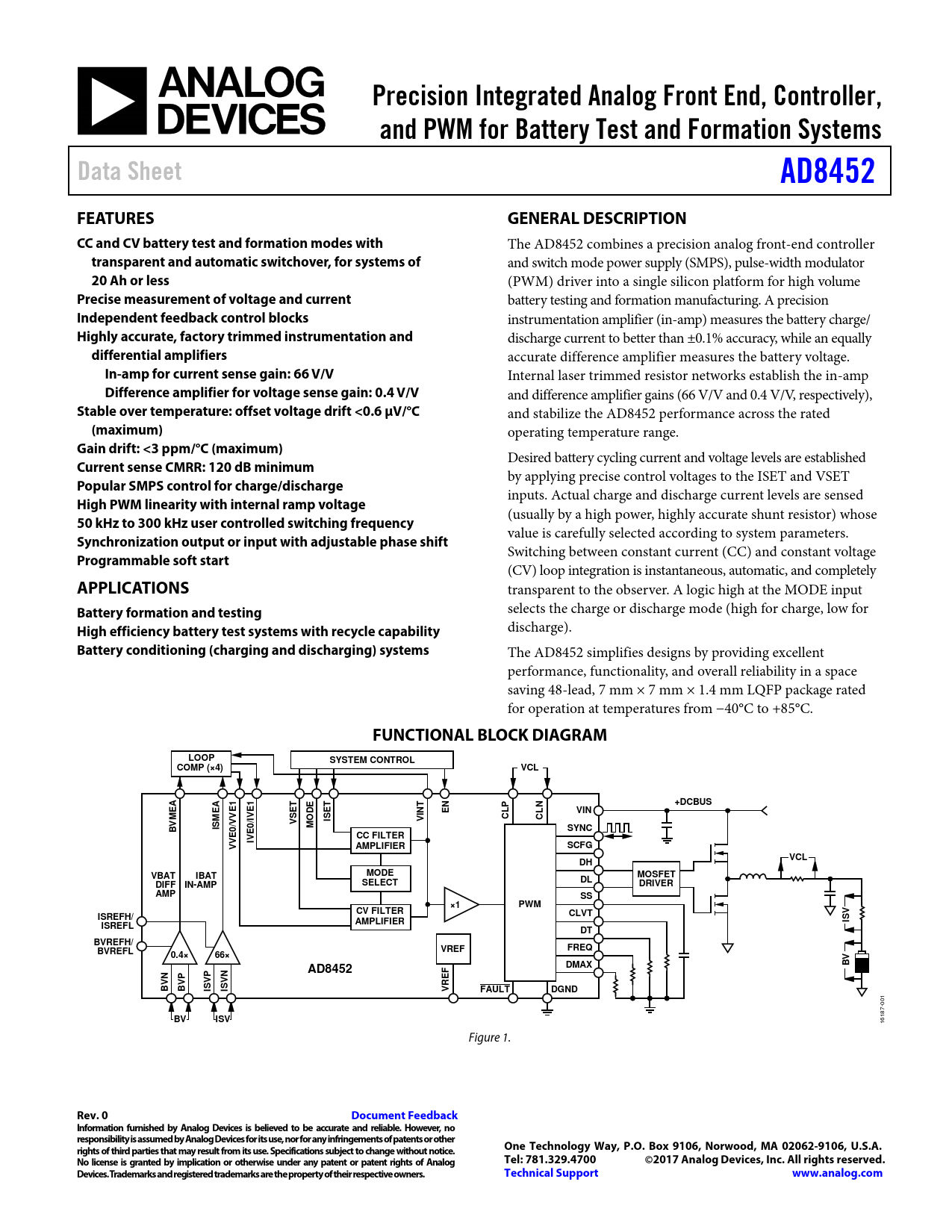 Precision Integrated Analog Front End, Controller,. and PWM for Battery Test and Formation Systems. Data Sheet. AD8452
