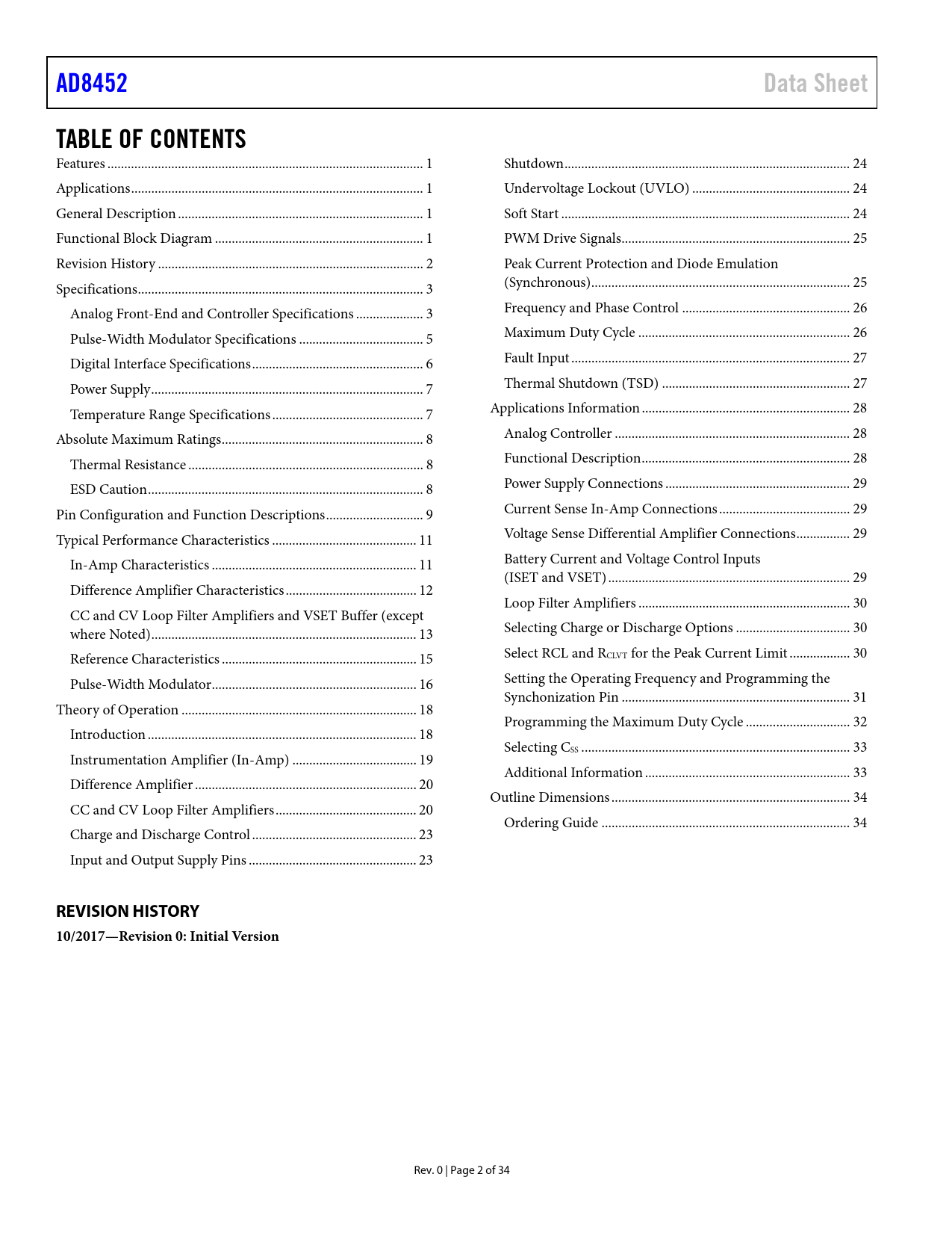 link to page 1 link to page 1 link to page 1 link to page 1 link to page 3 link to page 4 link to page 4 link to page 6 link to page 7 link to page 8 link to page 8 link to page 9 link to page 9 link to page 9 link to page 10 link to page 12 link to page 12 link to page 13 link to page 14 link to page 16 link to page 17 link to page 19 link to page 19 link to page 20 link to page 21 link to page 21 link to page 24 link to page 24 link to page 25 link to page 25 link to page 25 link to page 26 link to page 26 link to page 26 link to page 27 link to page 27 link to page 28 link to page 28 link to page 29 link to page 29 link to page 29 link to page 30 link to page 30 link to page 30 link to page 30 link to page 30 link to page 31 link to page 31 link to page 31 link to page 32 link to page 32 link to page 33 link to page 34 link to page 34 link to page 35 link to page 35 AD8452Data SheetTABLE OF CONTENTS Features .. 1 Shutdown ... 24 Applications ... 1 Undervoltage Lockout (UVLO) ... 24 General Description ... 1 Soft Start .. 24 Functional Block Diagram .. 1 PWM Drive Signals .. 25 Revision History ... 2 Peak Current Protection and Diode Emulation Specifications ... 3 (Synchronous) ... 25 Analog Front-End and Controller Specifications .. 3 Frequency and Phase Control .. 26 Pulse-Width Modulator Specifications ... 5 Maximum Duty Cycle ... 26 Digital Interface Specifications ... 6 Fault Input ... 27 Power Supply ... 7 Thermal Shutdown (TSD) .. 27 Temperature Range Specifications ... 7 Applications Information .. 28 Absolute Maximum Ratings .. 8 Analog Controller .. 28 Thermal Resistance .. 8 Functional Description .. 28 ESD Caution .. 8 Power Supply Connections ... 29 Pin Configuration and Function Descriptions ... 9 Current Sense In-Amp Connections ... 29 Typical Performance Characteristics ... 11 Voltage Sense Differential Amplifier Connections .. 29 In-Amp Characteristics ... 11 Battery Current and Voltage Control Inputs (ISET and VSET) .. 29 Difference Amplifier Characteristics ... 12 Loop Filter Amplifiers ... 30 CC and CV Loop Filter Amplifiers and VSET Buffer (except where Noted) ... 13 Selecting Charge or Discharge Options .. 30 Reference Characteristics .. 15 Select RCL and RCLVT for the Peak Current Limit .. 30 Pulse-Width Modulator ... 16 Setting the Operating Frequency and Programming the Synchonization Pin .. 31 Theory of Operation .. 18 Programming the Maximum Duty Cycle ... 32 Introduction .. 18 Selecting CSS .. 33 Instrumentation Amplifier (In-Amp) ... 19 Additional Information ... 33 Difference Amplifier .. 20 Outline Dimensions ... 34 CC and CV Loop Filter Amplifiers .. 20 Ordering Guide .. 34 Charge and Discharge Control ... 23 Input and Output Supply Pins .. 23 REVISION HISTORY10/2017—Revision 0: Initial Version Rev. 0 | Page 2 of 34 Document Outline Features Applications General Description Functional Block Diagram Table of Contents Revision History Specifications Analog Front-End and Controller Specifications Pulse-Width Modulator Specifications Digital Interface Specifications Power Supply Temperature Range Specifications Absolute Maximum Ratings Thermal Resistance ESD Caution Pin Configuration and Function Descriptions Typical Performance Characteristics In-Amp Characteristics Difference Amplifier Characteristics CC and CV Loop Filter Amplifiers and VSET Buffer (except where Noted) Reference Characteristics Pulse-Width Modulator Theory of Operation Introduction Instrumentation Amplifier (In-Amp) Reversing Polarity When Charging and Discharging In-Amp Offset Option Battery Reversal and Overvoltage Protection Difference Amplifier CC and CV Loop Filter Amplifiers Charging Lithium-Ion (Li-Ion) Cells Concepts of Constant Current (CC) and Constant Voltage (CV) Compensation Charge and Discharge Control Conditions to Charge and Discharge a Battery MODE Pin Input and Output Supply Pins Shutdown Undervoltage Lockout (UVLO) Soft Start PWM Drive Signals Peak Current Protection and Diode Emulation (Synchronous) Peak Current-Limit Detection Diode Emulation/Synchronous Mode Operation Frequency and Phase Control Internal Frequency Control External Frequency Control Operating Frequency Phase Shift Maximum Duty Cycle Fault Input Thermal Shutdown (TSD) Applications Information Analog Controller Functional Description Power Supply Connections Current Sense In-Amp Connections Current Sensors Optional Low-Pass Filter Voltage Sense Differential Amplifier Connections Battery Current and Voltage Control Inputs (ISET and VSET) Loop Filter Amplifiers Selecting Charge or Discharge Options Select RCL and RCLVT for the Peak Current Limit Setting the Operating Frequency and Programming the Synchonization Pin Select RFREQ for Standalone or Master Clock Selecting RFREQ for a Slave Device Programming the External Clock Phase Shift Programming the Dead Time Programming the Maximum Duty Cycle Selecting CSS Additional Information Outline Dimensions Ordering Guide
