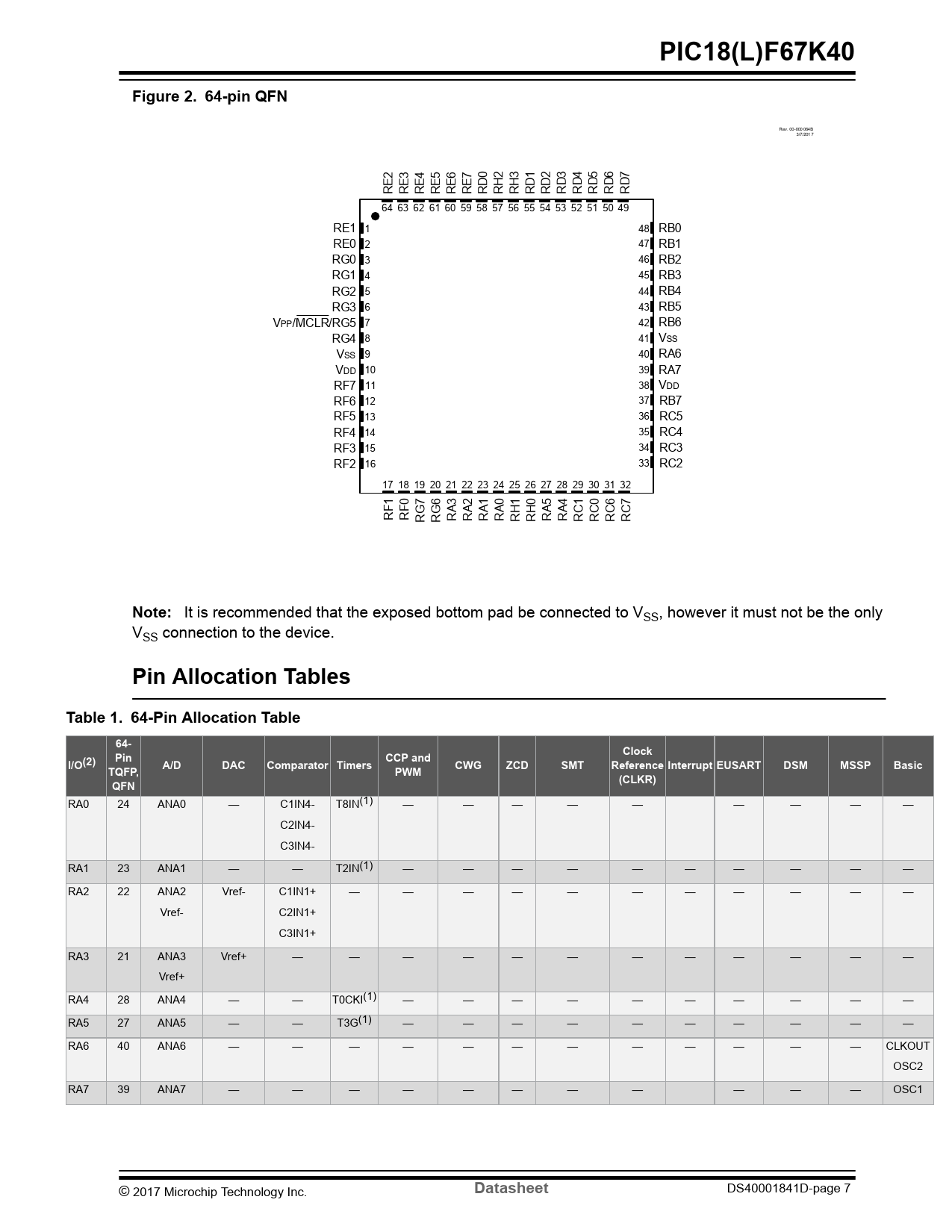 | Pages / Page | 879 / 7 — PIC18(L)F67K40. Figure 2. 64-pin QFN. Note: . Pin Allocation Tables. … |