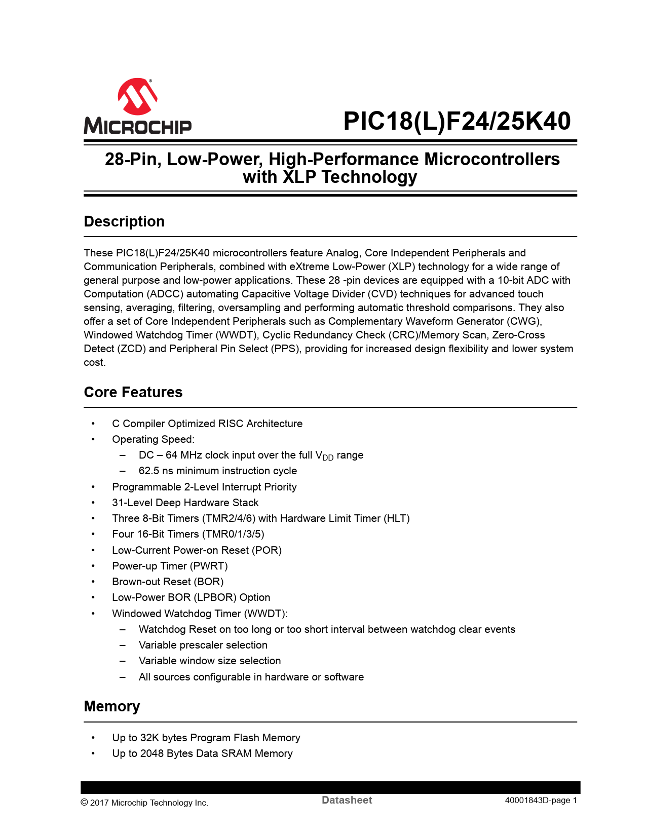 PIC18(L)F24/25K40. 28-Pin, Low-Power, High-Performance Microcontrollers. with XLP Technology. Description. Core Features. Memory