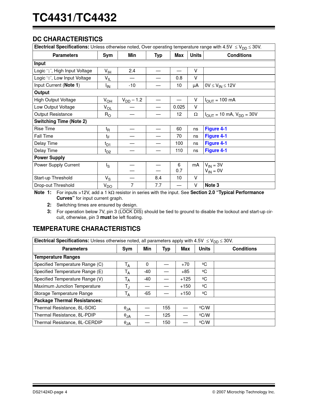 TC4431/TC4432. DC CHARACTERISTICS. Electrical Specifications:. Parameters. Sym. Min. Typ. Max. Units. Conditions. Input. Note 1. Output