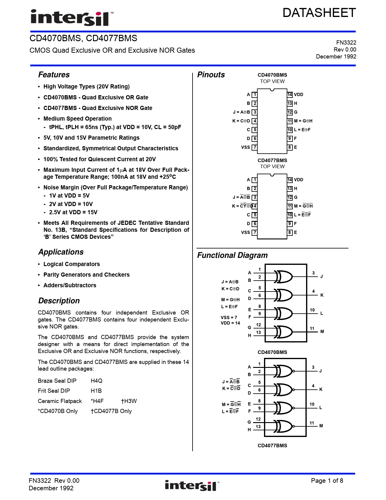 DATASHEET CD4070BMS, CD4077BMS FN3322 CMOS Quad Exclusive OR and Exclusive NOR Gates Rev 0.00 December 1992
