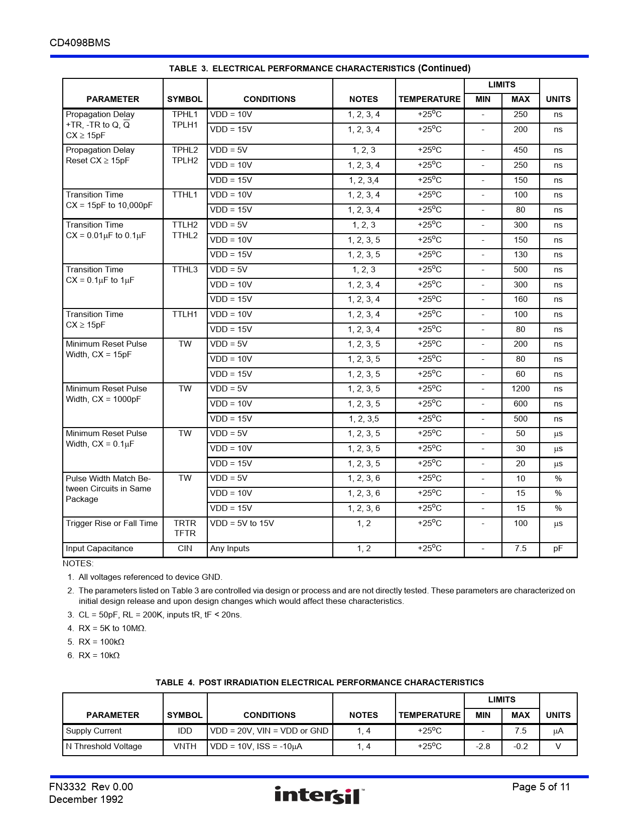 Propagation Delay TPHL1 VDD = 10V 1, 2, 3, 4 +25oC - 250 ns +TR, -TR to Q, Q TPLH1 VDD = 15V 1, 2, 3, 4 +25oC - 200 ns CX 15pF Propagation Delay TPHL2 VDD = 5V 1, 2, 3 +25oC - 450 ns Reset CX 15pF TPLH2 VDD = 10V 1, 2, 3, 4 +25oC - 250 ns VDD = 15V 1, 2, 3,4 +25oC - 150 ns Transition Time TTHL1 VDD = 10V 1, 2, 3, 4 +25oC - 100 ns CX = 15pF to 10,000pF VDD = 15V 1, 2, 3, 4 +25oC - 80 ns Transition Time TTLH2 VDD = 5V 1, 2, 3 +25oC - 300 ns CX = 0.01F to 0.1F TTHL2 VDD = 10V 1, 2, 3, 5 +25oC - 150 ns VDD = 15V 1, 2, 3, 5 +25oC - 130 ns Transition Time TTHL3 VDD = 5V 1, 2, 3 +25oC - 500 ns CX = 0.1F to 1F VDD = 10V 1, 2, 3, 4 +25oC - 300 ns VDD = 15V 1, 2, 3, 4 +25oC - 160 ns Transition Time TTLH1 VDD = 10V 1, 2, 3, 4 +25oC - 100 ns CX 15pF VDD = 15V 1, 2, 3, 4 +25oC - 80 ns Minimum Reset Pulse TW VDD = 5V 1, 2, 3, 5 +25oC - 200 ns Width, CX = 15pF VDD = 10V 1, 2, 3, 5 +25oC - 80 ns VDD = 15V 1, 2, 3, 5 +25oC - 60 ns Minimum Reset Pulse TW VDD = 5V 1, 2, 3, 5 +25oC - 1200 ns Width, CX = 1000pF VDD = 10V 1, 2, 3, 5 +25oC - 600 ns VDD = 15V 1, 2, 3,5 +25oC - 500 ns Minimum Reset Pulse TW VDD = 5V 1, 2, 3, 5 +25oC - 50 s Width, CX = 0.1F VDD = 10V 1, 2, 3, 5 +25oC - 30 s VDD = 15V 1, 2, 3, 5 +25oC - 20 s Pulse Width Match Be- TW VDD = 5V 1, 2, 3, 6 +25oC - 10 % tween Circuits in Same VDD = 10V 1, 2, 3, 6 +25oC - 15 % Package VDD = 15V 1, 2, 3, 6 +25oC - 15 % Trigger Rise or Fall Time TRTR VDD = 5V to 15V 1, 2 +25oC - 100 s TFTR Input Capacitance CIN Any Inputs 1, 2 +25oC - 7.5 pF NOTES: 1. All voltages referenced to device GND. 2. The parameters listed on Table 3 are controlled via design or process and are not directly tested. These parameters are characterized on initial design release and upon design changes which would affect these characteristics. 3. CL = 50pF, RL = 200K, inputs tR, tF < 20ns. 4. RX = 5K to 10M. 5. RX = 100k 6. RX = 10k