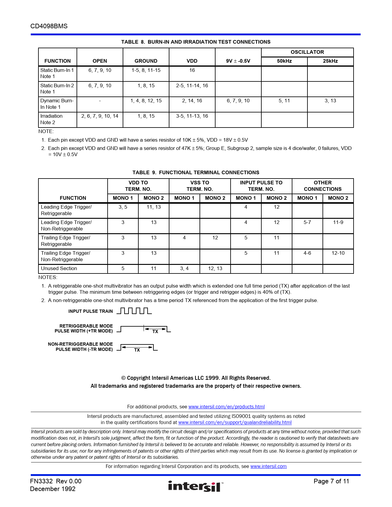 Static Burn-In 1 6, 7, 9, 10 1-5, 8, 11-15 16 Note 1 Static Burn-In 2 6, 7, 9, 10 1, 8, 15 2-5, 11-14, 16 Note 1 Dynamic Burn- - 1, 4, 8, 12, 15 2, 14, 16 6, 7, 9, 10 5, 11 3, 13 In Note 1 Irradiation 2, 6, 7, 9, 10, 14 1, 8, 15 3-5, 11-13, 16 Note 2 NOTE: 1. Each pin except VDD and GND will have a series resistor of 10K 5%, VDD = 18V 0.5V 2. Each pin except VDD and GND will have a series resistor of 47K 5%; Group E, Subgroup 2, sample size is 4 dice/wafer, 0 failures, VDD = 10V 0.5V