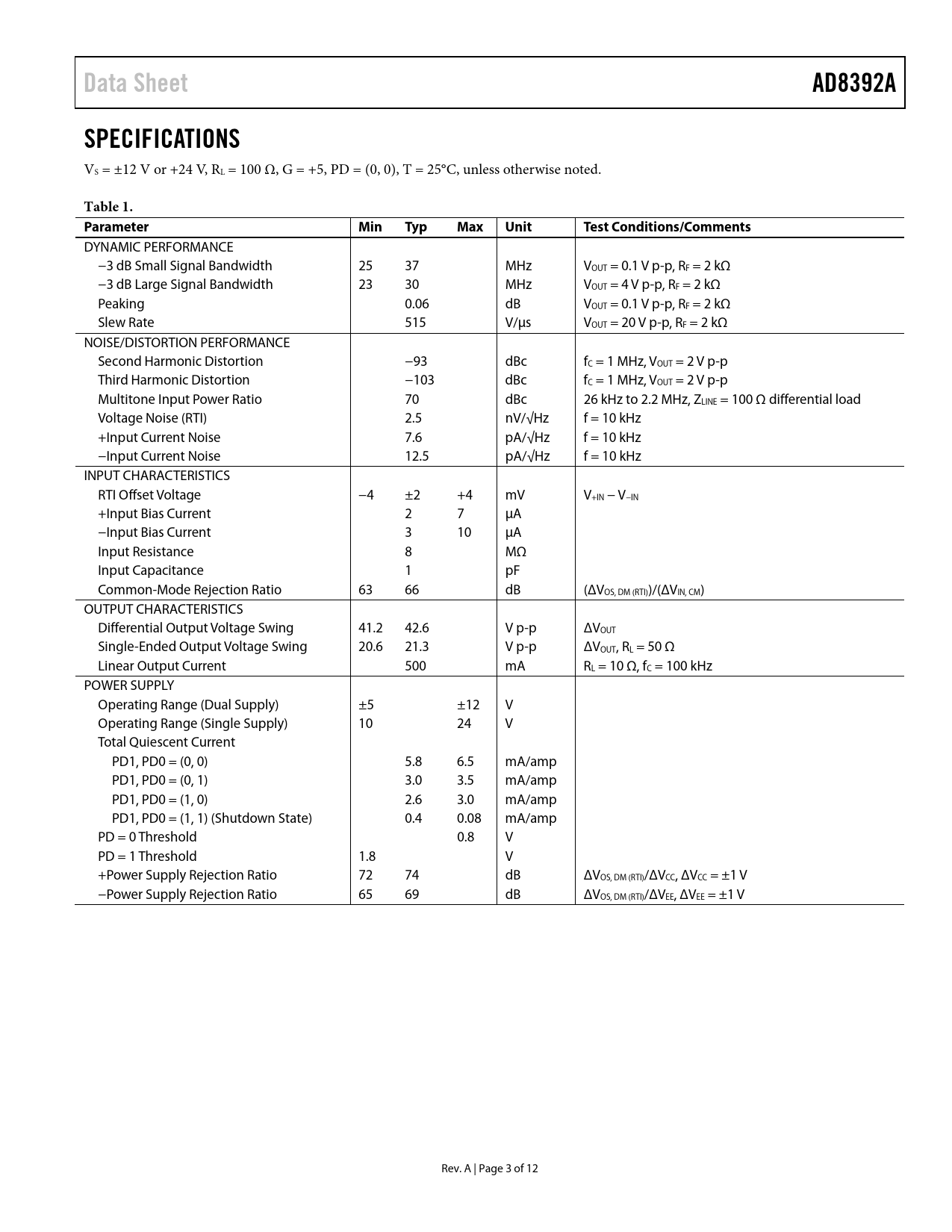 Data Sheet AD8392A SPECIFICATIONS