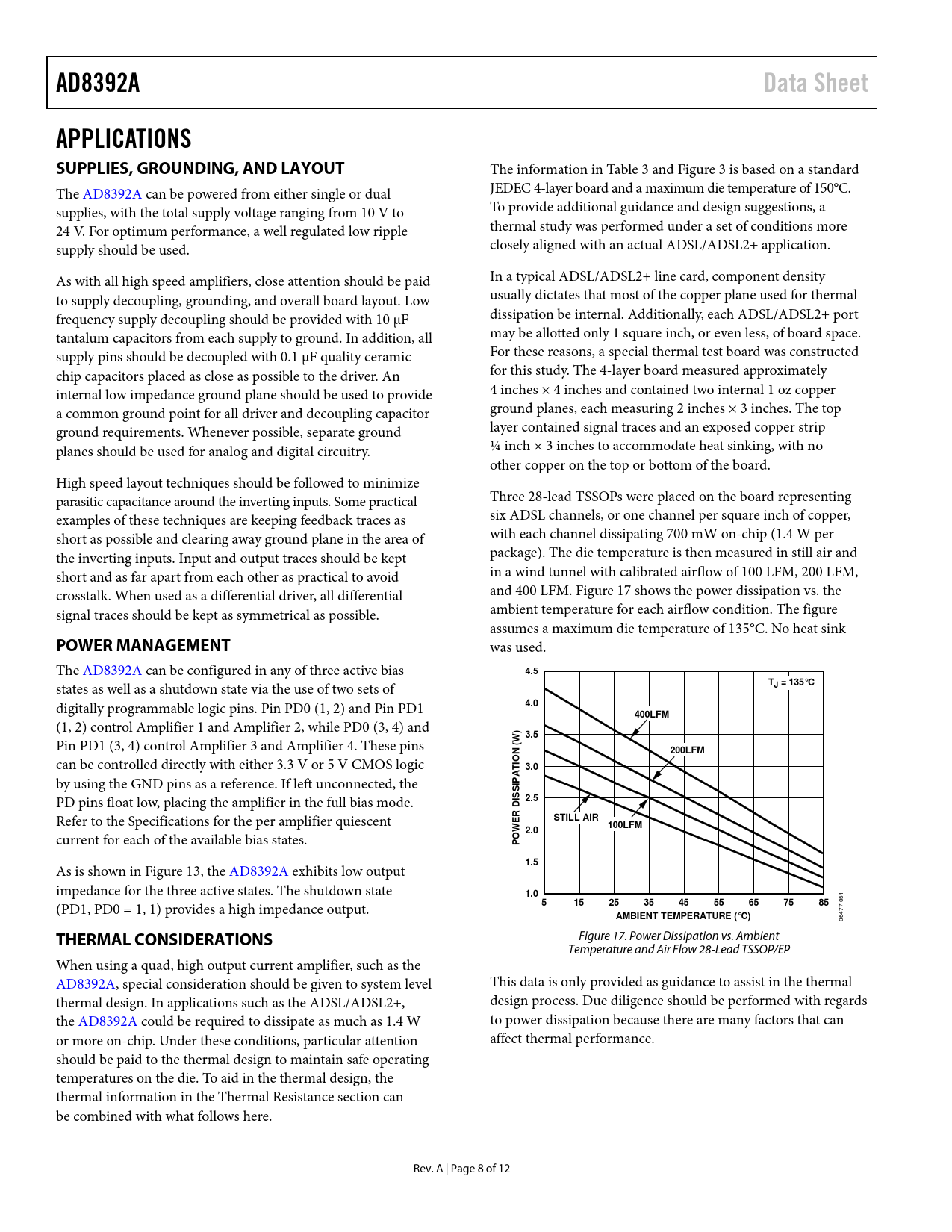 The information in Table 3 and Figure 3 is based on a standard The AD8392A can be powered from either single or dual JEDEC 4-layer board and a maximum die temperature of 150°C. supplies, with the total supply voltage ranging from 10 V to To provide additional guidance and design suggestions, a 24 V. For optimum performance, a well regulated low ripple thermal study was performed under a set of conditions more supply should be used. closely aligned with an actual ADSL/ADSL2+ application. As with all high speed amplifiers, close attention should be paid In a typical ADSL/ADSL2+ line card, component density to supply decoupling, grounding, and overall board layout. Low usual y dictates that most of the copper plane used for thermal frequency supply decoupling should be provided with 10 µF dissipation be internal. Additional y, each ADSL/ADSL2+ port tantalum capacitors from each supply to ground. In addition, all may be allotted only 1 square inch, or even less, of board space. supply pins should be decoupled with 0.1 µF quality ceramic For these reasons, a special thermal test board was constructed chip capacitors placed as close as possible to the driver. An for this study. The 4-layer board measured approximately internal low impedance ground plane should be used to provide 4 inches × 4 inches and contained two internal 1 oz copper a common ground point for al driver and decoupling capacitor ground planes, each measuring 2 inches × 3 inches. The top ground requirements. Whenever possible, separate ground layer contained signal traces and an exposed copper strip planes should be used for analog and digital circuitry. ¼ inch × 3 inches to accommodate heat sinking, with no other copper on the top or bottom of the board. High speed layout techniques should be fol owed to minimize parasitic capacitance around the inverting inputs. Some practical Three 28-lead TSSOPs were placed on the board representing examples of these techniques are keeping feedback traces as six ADSL channels, or one channel per square inch of copper, short as possible and clearing away ground plane in the area of with each channel dissipating 700 mW on-chip (1.4 W per the inverting inputs. Input and output traces should be kept package). The die temperature is then measured in stil air and short and as far apart from each other as practical to avoid in a wind tunnel with calibrated airflow of 100 LFM, 200 LFM, crosstalk. When used as a differential driver, all differential and 400 LFM. Figure 17 shows the power dissipation vs. the signal traces should be kept as symmetrical as possible. ambient temperature for each airflow condition. The figure assumes a maximum die temperature of 135°C. No heat sink
