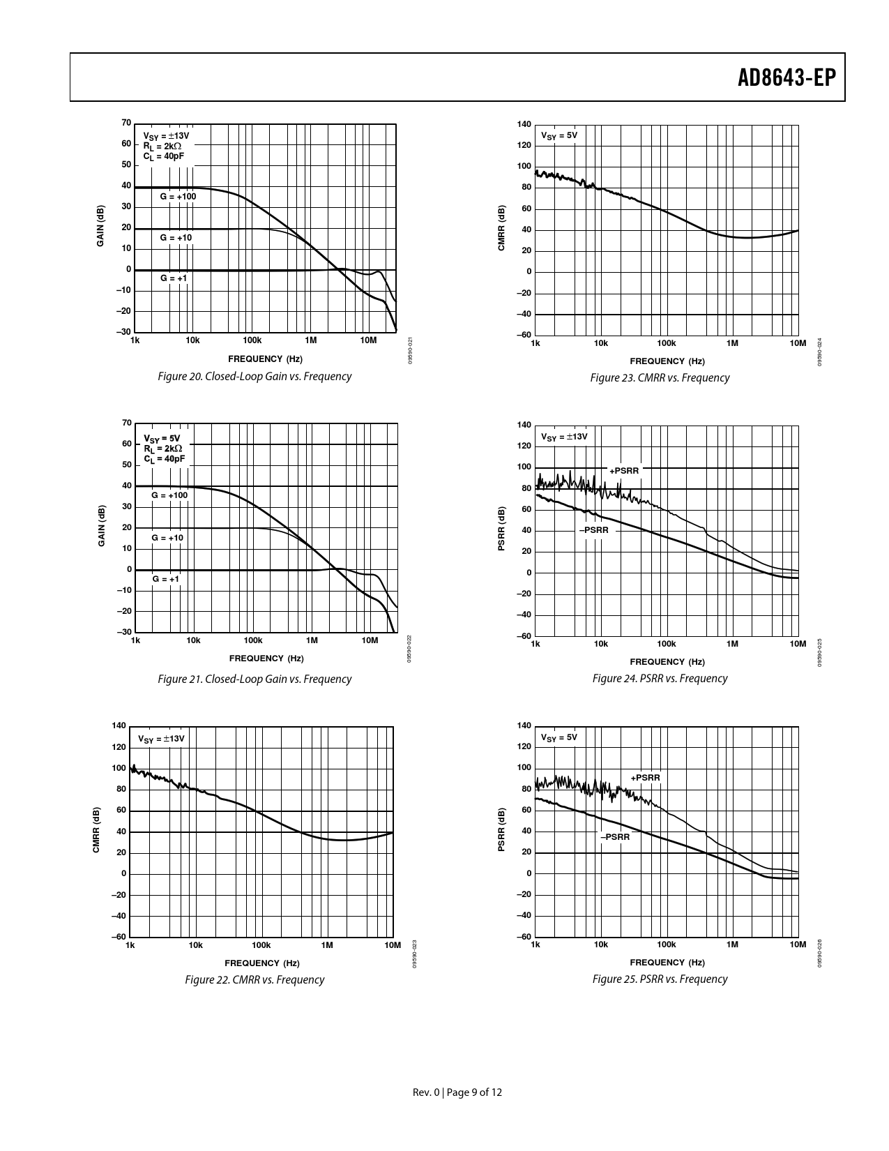 09590- Figure 21. Closed-Loop Gain vs. Frequency Figure 24. PSRR vs. Frequency