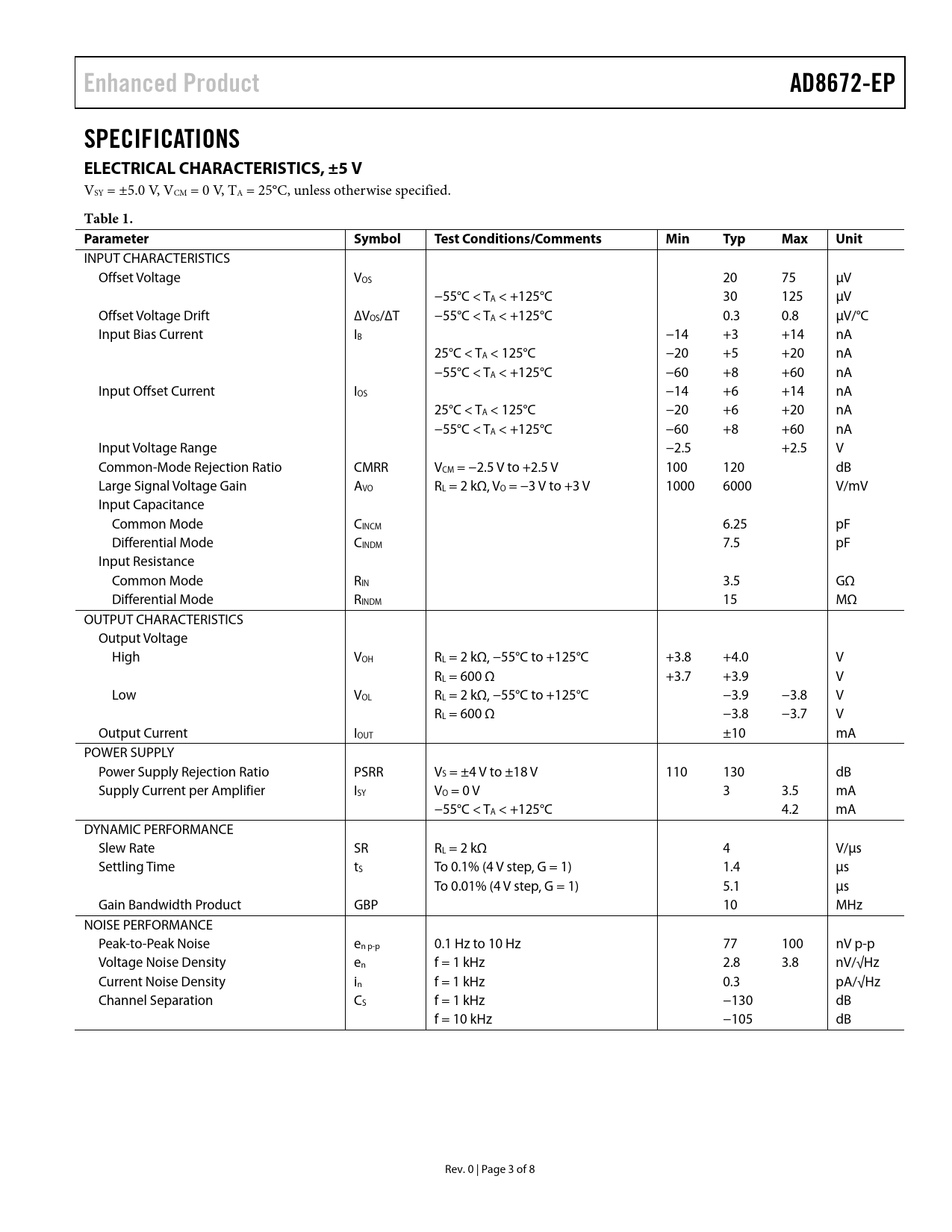 Enhanced ProductAD8672-EPSPECIFICATIONS ELECTRICAL CHARACTERISTICS, ±5 V VSY = ±5.0 V, VCM = 0 V, TA = 25°C, unless otherwise specified. Table 1. ParameterSymbolTest Conditions/CommentsMinTypMaxUnit INPUT CHARACTERISTICS Offset Voltage VOS 20 75 μV −55°C < TA < +125°C 30 125 μV Offset Voltage Drift ∆VOS/∆T −55°C < TA < +125°C 0.3 0.8 μV/°C Input Bias Current IB −14 +3 +14 nA 25°C < TA < 125°C −20 +5 +20 nA −55°C < TA < +125°C −60 +8 +60 nA Input Offset Current IOS −14 +6 +14 nA 25°C < TA < 125°C −20 +6 +20 nA −55°C < TA < +125°C −60 +8 +60 nA Input Voltage Range −2.5 +2.5 V Common-Mode Rejection Ratio CMRR VCM = −2.5 V to +2.5 V 100 120 dB Large Signal Voltage Gain AVO RL = 2 kΩ, VO = −3 V to +3 V 1000 6000 V/mV Input Capacitance Common Mode CINCM 6.25 pF Differential Mode CINDM 7.5 pF Input Resistance Common Mode RIN 3.5 GΩ Differential Mode RINDM 15 MΩ OUTPUT CHARACTERISTICS Output Voltage High VOH RL = 2 kΩ, −55°C to +125°C +3.8 +4.0 V RL = 600 Ω +3.7 +3.9 V Low VOL RL = 2 kΩ, −55°C to +125°C −3.9 −3.8 V RL = 600 Ω −3.8 −3.7 V Output Current IOUT ±10 mA POWER SUPPLY Power Supply Rejection Ratio PSRR VS = ±4 V to ±18 V 110 130 dB Supply Current per Amplifier ISY VO = 0 V 3 3.5 mA −55°C < TA < +125°C 4.2 mA DYNAMIC PERFORMANCE Slew Rate SR RL = 2 kΩ 4 V/μs Settling Time tS To 0.1% (4 V step, G = 1) 1.4 μs To 0.01% (4 V step, G = 1) 5.1 μs Gain Bandwidth Product GBP 10 MHz NOISE PERFORMANCE Peak-to-Peak Noise en p-p 0.1 Hz to 10 Hz 77 100 nV p-p Voltage Noise Density en f = 1 kHz 2.8 3.8 nV/√Hz Current Noise Density in f = 1 kHz 0.3 pA/√Hz Channel Separation CS f = 1 kHz −130 dB f = 10 kHz −105 dB Rev. 0 | Page 3 of 8 Document Outline Features Enhanced Product Features Applications Pin Configuration General Description Table of Contents Revision History Specifications Electrical Characteristics, ±5 V Electrical Characteristics, ±15 V Absolute Maximum Ratings Thermal Resistance ESD Caution Typical Performance Charateristics Outline Dimensions Ordering Guide