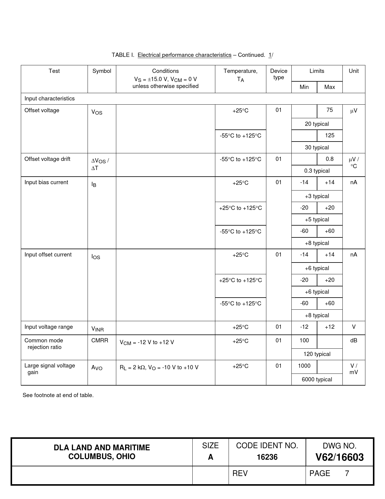 TABLE I. Electrical performance characteristics – Continued. 1/ Test Symbol Conditions Temperature, Device Limits Unit V type S = 15.0 V, VCM = 0 V TA unless otherwise specified Min Max Input characteristics Offset voltage VOS +25C 01 75 V 20 typical -55C to +125C 125 30 typical Offset voltage drift V -55C to +125C 01 0.8 V / OS / T C 0.3 typical Input bias current IB +25C 01 -14 +14 nA +3 typical +25C to +125C -20 +20 +5 typical -55C to +125C -60 +60 +8 typical Input offset current IOS +25C 01 -14 +14 nA +6 typical +25C to +125C -20 +20 +6 typical -55C to +125C -60 +60 +8 typical Input voltage range VINR +25C 01 -12 +12 V Common mode CMRR VCM = -12 V to +12 V +25C 01 100 dB rejection ratio 120 typical Large signal voltage AVO RL = 2 k, VO = -10 V to +10 V +25C 01 1000 V / gain mV 6000 typical See footnote at end of table. DLA LAND AND MARITIME SIZE CODE IDENT NO. DWG NO. COLUMBUS, OHIOA16236V62/16603 REV PAGE 7