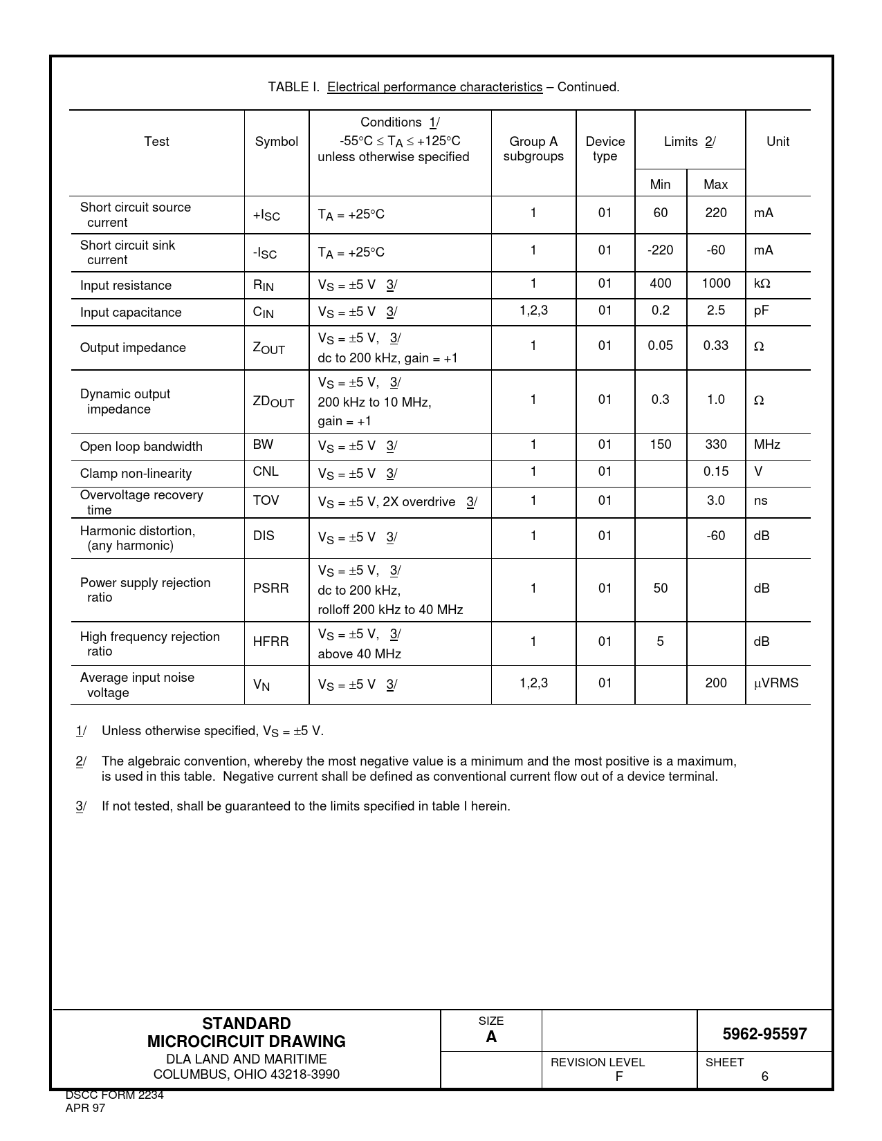 TABLE I. Electrical performance characteristics – Continued. Conditions 1/ Test Symbol -55°C ≤ TA ≤ +125°C Group A Device Limits 2/ Unit unless otherwise specified subgroups type Min Max Short circuit source +I current SC TA = +25°C 1 01 60 220 mA Short circuit sink -I current SC TA = +25°C 1 01 -220 -60 mA Input resistance RIN VS = ±5 V 3/ 1 01 400 1000 kΩ Input capacitance CIN VS = ±5 V 3/ 1,2,3 01 0.2 2.5 pF VS = ±5 V, 3/ Output impedance ZOUT 1 01 0.05 0.33 Ω dc to 200 kHz, gain = +1 VS = ±5 V, 3/ Dynamic output ZD 200 kHz to 10 MHz, 1 01 0.3 1.0 Ω impedance OUT gain = +1 Open loop bandwidth BW VS = ±5 V 3/ 1 01 150 330 MHz Clamp non-linearity CNL VS = ±5 V 3/ 1 01 0.15 V Overvoltage recovery TOV V time S = ±5 V, 2X overdrive 3/ 1 01 3.0 ns Harmonic distortion, DIS V (any harmonic) S = ±5 V 3/ 1 01 -60 dB VS = ±5 V, 3/ Power supply rejection PSRR dc to 200 kHz, 1 01 50 dB ratio rolloff 200 kHz to 40 MHz High frequency rejection V HFRR S = ±5 V, 3/ 1 01 5 dB ratio above 40 MHz Average input noise V voltage N VS = ±5 V 3/ 1,2,3 01 200 µVRMS 1/ Unless otherwise specified, VS = ±5 V. 2/ The algebraic convention, whereby the most negative value is a minimum and the most positive is a maximum, is used in this table. Negative current shall be defined as conventional current flow out of a device terminal. 3/ If not tested, shall be guaranteed to the limits specified in table I herein.