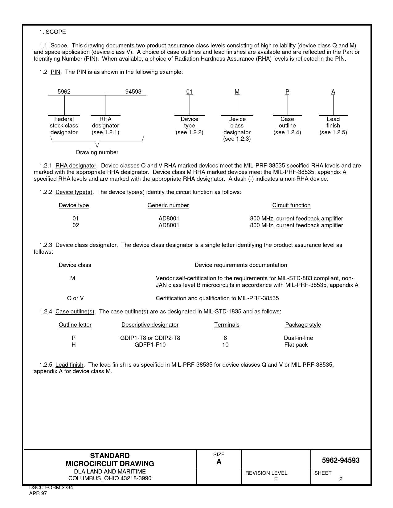 1. SCOPE 1.1 Scope. This drawing documents two product assurance class levels consisting of high reliability (device class Q and M) and space application (device class V). A choice of case outlines and lead finishes are available and are reflected in the Part or Identifying Number (PIN). When available, a choice of Radiation Hardness Assurance (RHA) levels is reflected in the PIN. 1.2 PIN. The PIN is as shown in the following example: 5962 - 94593 01 M P A Federal RHA Device Device Case Lead stock class designator type class outline finish designator (see 1.2.1) (see 1.2.2) designator (see 1.2.4) (see 1.2.5) \ / (see 1.2.3) \/ Drawing number 1.2.1 RHA designator. Device classes Q and V RHA marked devices meet the MIL-PRF-38535 specified RHA levels and are marked with the appropriate RHA designator. Device class M RHA marked devices meet the MIL-PRF-38535, appendix A specified RHA levels and are marked with the appropriate RHA designator. A dash (-) indicates a non-RHA device. 1.2.2 Device type(s). The device type(s) identify the circuit function as follows: Device type Generic number Circuit function 01 AD8001 800 MHz, current feedback amplifier 02 AD8001 800 MHz, current feedback amplifier 1.2.3 Device class designator. The device class designator is a single letter identifying the product assurance level as follows: Device class Device requirements documentation M Vendor self-certification to the requirements for MIL-STD-883 compliant, non- JAN class level B microcircuits in accordance with MIL-PRF-38535, appendix A Q or V Certification and qualification to MIL-PRF-38535 1.2.4 Case outline(s). The case outline(s) are as designated in MIL-STD-1835 and as follows: Outline letter Descriptive designator Terminals Package style P GDIP1-T8 or CDIP2-T8 8 Dual-in-line H GDFP1-F10 10 Flat pack 1.2.5 Lead finish. The lead finish is as specified in MIL-PRF-38535 for device classes Q and V or MIL-PRF-38535, appendix A for device class M. STANDARD SIZE 5962-94593MICROCIRCUIT DRAWINGA DLA LAND AND MARITIME REVISION LEVEL SHEET COLUMBUS, OHIO 43218-3990 E 2 DSCC FORM 2234 APR 97 Document Outline DEPARTMENT OF DEFENSE SPECIFICATION DEPARTMENT OF DEFENSE STANDARDS