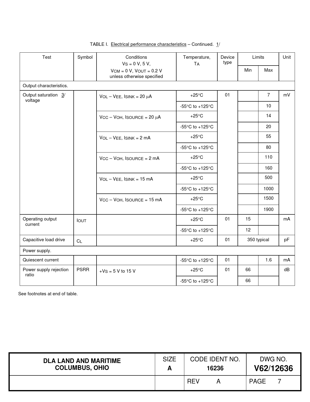 TABLE I. Electrical performance characteristics – Continued. 1/ Test Symbol Conditions Temperature, Device Limits Unit VS = 0 V, 5 V, TA type VCM = 0 V, VOUT = 0.2 V Min Max unless otherwise specified Output characteristics. Output saturation 3/ VOL – VEE, ISINK = 20 A +25C 01 7 mV voltage -55C to +125C 10 VCC – VOH, ISOURCE = 20 A +25C 14 -55C to +125C 20 VOL – VEE, ISINK = 2 mA +25C 55 -55C to +125C 80 VCC – VOH, ISOURCE = 2 mA +25C 110 -55C to +125C 160 VOL – VEE, ISINK = 15 mA +25C 500 -55C to +125C 1000 VCC – VOH, ISOURCE = 15 mA +25C 1500 -55C to +125C 1900 Operating output IOUT +25C 01 15 mA current -55C to +125C 12 Capacitive load drive CL +25C 01 350 typical pF Power supply. Quiescent current -55C to +125C 01 1.6 mA Power supply rejection PSRR +VS = 5 V to 15 V +25C 01 66 dB ratio -55C to +125C 66 See footnotes at end of table.