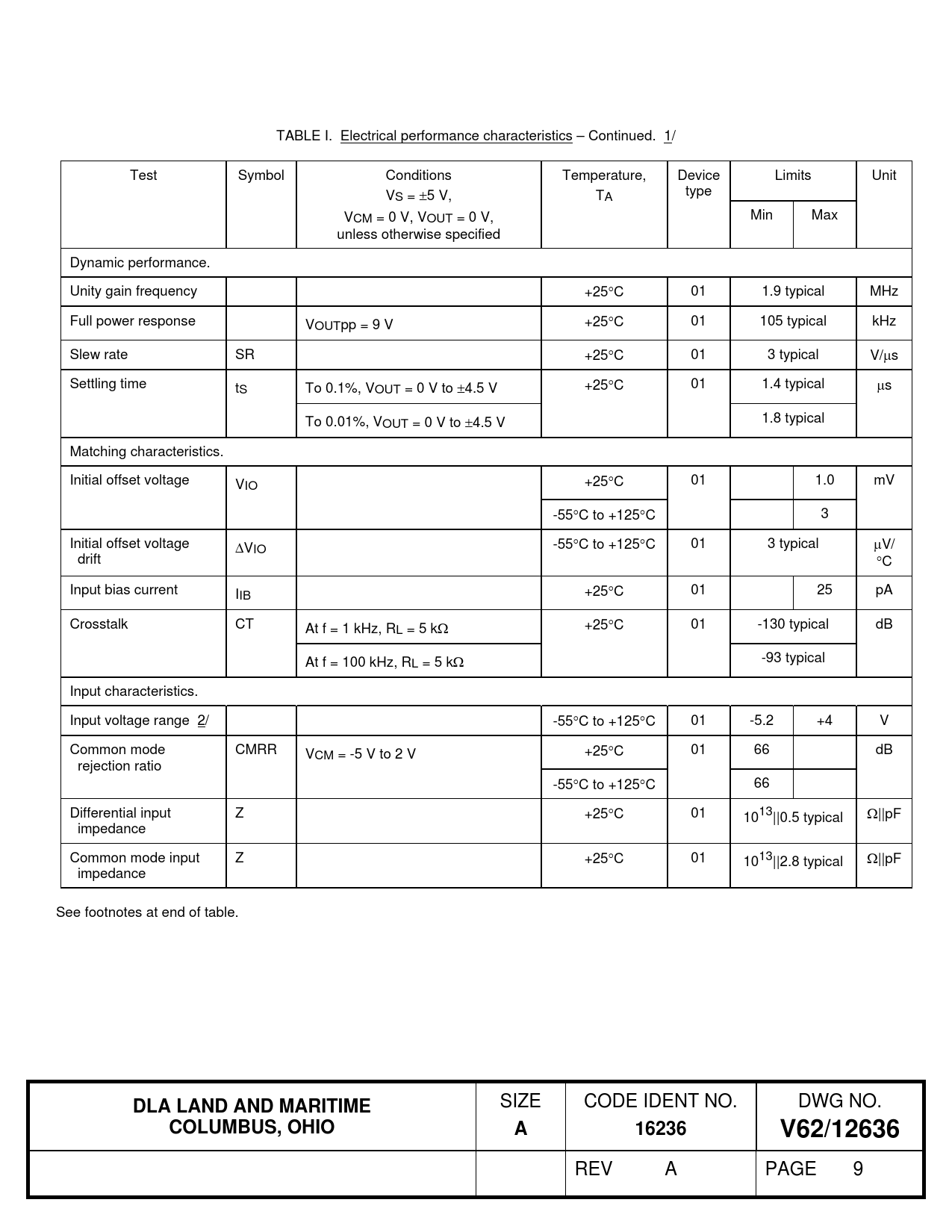 TABLE I. Electrical performance characteristics – Continued. 1/ Test Symbol Conditions Temperature, Device Limits Unit VS = 5 V, TA type VCM = 0 V, VOUT = 0 V, Min Max unless otherwise specified Dynamic performance. Unity gain frequency +25C 01 1.9 typical MHz Full power response VOUTpp = 9 V +25C 01 105 typical kHz Slew rate SR +25C 01 3 typical V/s Settling time tS To 0.1%, VOUT = 0 V to 4.5 V +25C 01 1.4 typical s To 0.01%, VOUT = 0 V to 4.5 V 1.8 typical Matching characteristics. Initial offset voltage VIO +25C 01 1.0 mV -55C to +125C 3 Initial offset voltage VIO -55C to +125C 01 3 typical V/ drift C Input bias current IIB +25C 01 25 pA Crosstalk CT At f = 1 kHz, RL = 5 k +25C 01 -130 typical dB At f = 100 kHz, RL = 5 k -93 typical Input characteristics. Input voltage range 2/ -55C to +125C 01 -5.2 +4 V Common mode CMRR VCM = -5 V to 2 V +25C 01 66 dB rejection ratio -55C to +125C 66 Differential input Z +25C 01 1013||0.5 typical ||pF impedance Common mode input Z +25C 01 1013||2.8 typical ||pF impedance See footnotes at end of table.