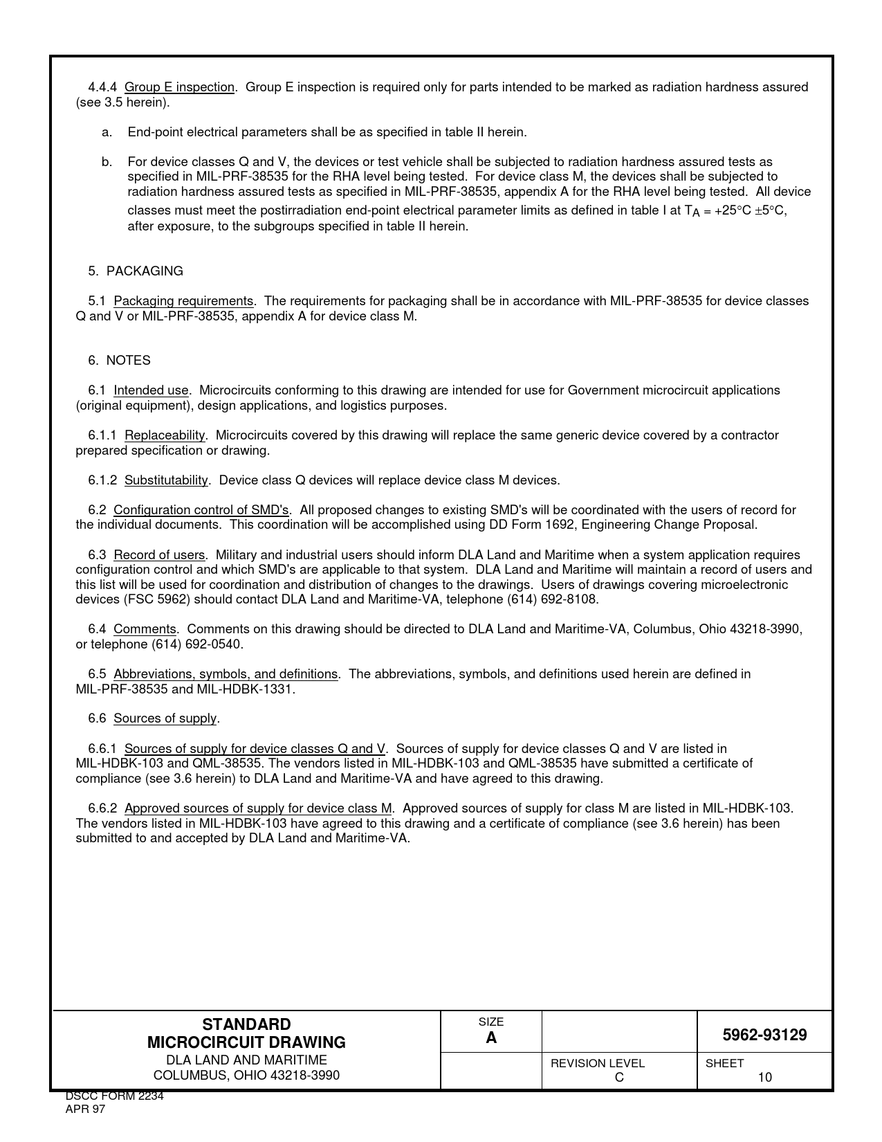 DLA LAND AND MARITIME REVISION LEVEL SHEET COLUMBUS, OHIO 43218-3990 C 10 DSCC FORM 2234 APR 97 Document Outline DEPARTMENT OF DEFENSE SPECIFICATION DEPARTMENT OF DEFENSE STANDARDS