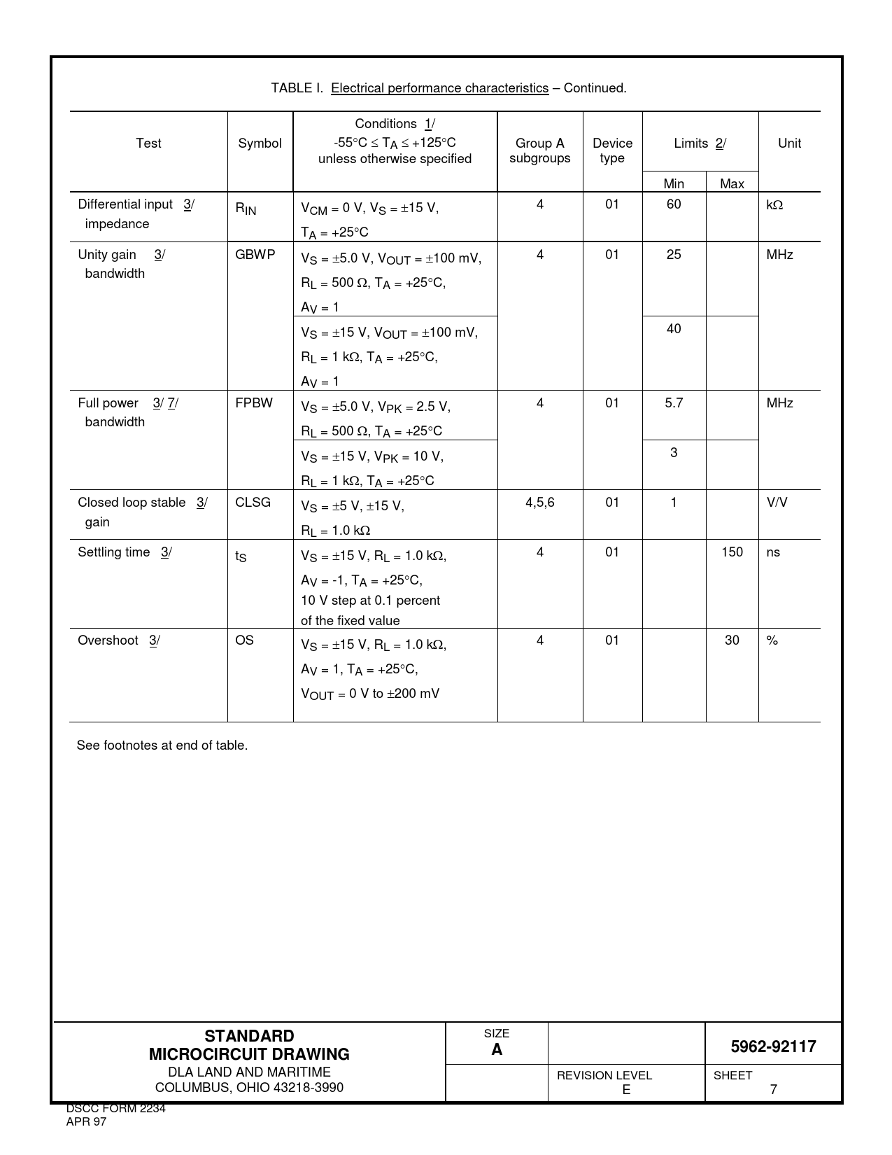 TABLE I. Electrical performance characteristics – Continued. Conditions 1/ Test Symbol -55°C ≤ TA ≤ +125°C Group A Device Limits 2/ Unit unless otherwise specified subgroups type Min Max Differential input 3/ R 4 01 60 kΩ IN VCM = 0 V, VS = ±15 V, impedance TA = +25°C Unity gain 3/ GBWP V 4 01 25 MHz S = ±5.0 V, VOUT = ±100 mV, bandwidth RL = 500 Ω, TA = +25°C, AV = 1 V 40 S = ±15 V, VOUT = ±100 mV, RL = 1 kΩ, TA = +25°C, AV = 1 Full power 3/ 7/ FPBW V 4 01 5.7 MHz S = ±5.0 V, VPK = 2.5 V, bandwidth RL = 500 Ω, TA = +25°C V 3 S = ±15 V, VPK = 10 V, RL = 1 kΩ, TA = +25°C Closed loop stable 3/ CLSG V 4,5,6 01 1 V/V S = ±5 V, ±15 V, gain RL = 1.0 kΩ Settling time 3/ t 4 01 150 ns S VS = ±15 V, RL = 1.0 kΩ, AV = -1, TA = +25°C, 10 V step at 0.1 percent of the fixed value Overshoot 3/ OS V 4 01 30 % S = ±15 V, RL = 1.0 kΩ, AV = 1, TA = +25°C, VOUT = 0 V to ±200 mV See footnotes at end of table. STANDARD SIZE 5962-92117MICROCIRCUIT DRAWINGA DLA LAND AND MARITIME REVISION LEVEL SHEET COLUMBUS, OHIO 43218-3990 E 7 DSCC FORM 2234 APR 97 Document Outline DEPARTMENT OF DEFENSE SPECIFICATION DEPARTMENT OF DEFENSE STANDARDS