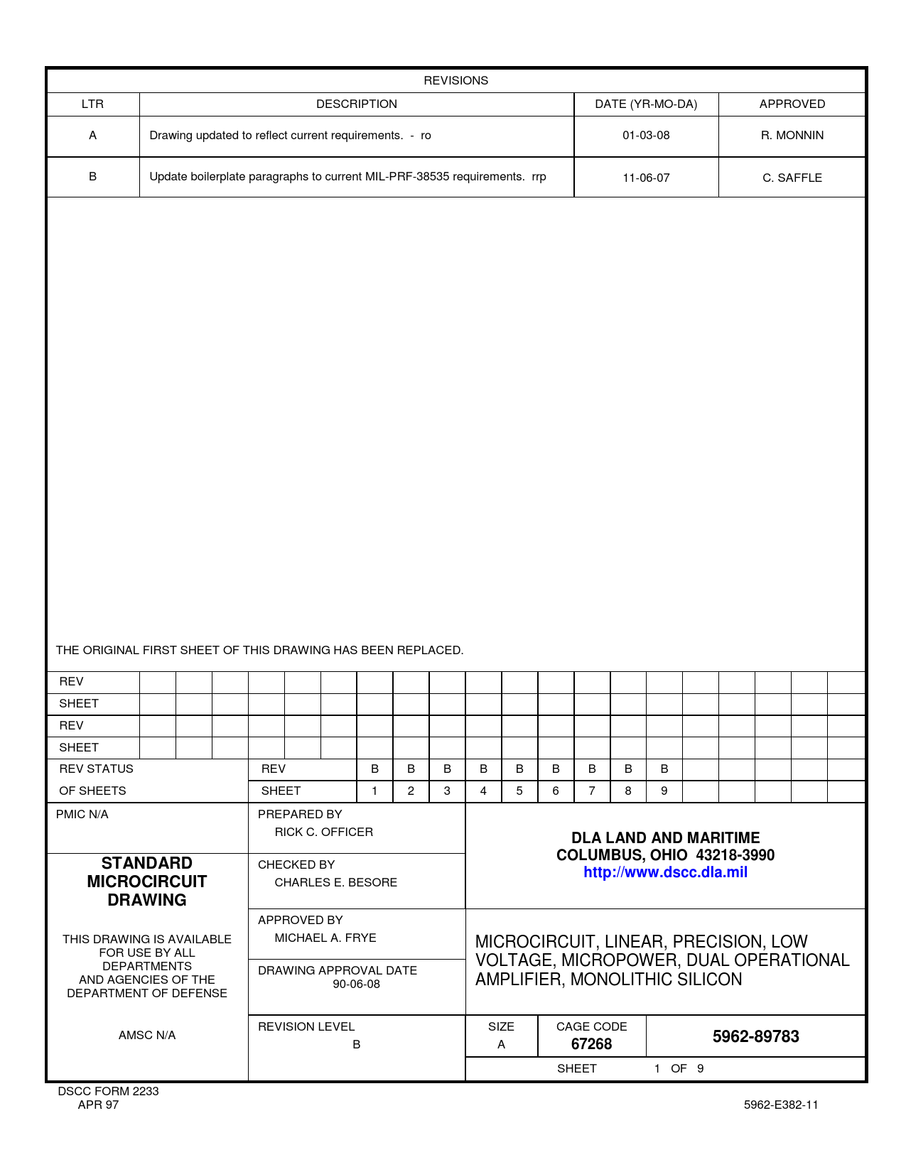 REVISIONS LTR DESCRIPTION DATE (YR-MO-DA) APPROVED A Drawing updated to reflect current requirements. - ro 01-03-08 R. MONNIN B Update boilerplate paragraphs to current MIL-PRF-38535 requirements. rrp 11-06-07 C. SAFFLE THE ORIGINAL FIRST SHEET OF THIS DRAWING HAS BEEN REPLACED. REV SHEET REV SHEET REV STATUS REV B B B B B B B B B OF SHEETS SHEET 1 2 3 4 5 6 7 8 9 PMIC N/A PREPARED BY RICK C. OFFICER DLA LAND AND MARITIMECOLUMBUS, OHIO 43218-3990STANDARD CHECKED BY http://www.dscc.dla.milMICROCIRCUIT CHARLES E. BESORE DRAWING APPROVED BY THIS DRAWING IS AVAILABLE MICHAEL A. FRYE MICROCIRCUIT, LINEAR, PRECISION, LOW FOR USE BY ALL DEPARTMENTS VOLTAGE, MICROPOWER, DUAL OPERATIONAL DRAWING APPROVAL DATE AND AGENCIES OF THE AMPLIFIER, MONOLITHIC SILICON 90-06-08 DEPARTMENT OF DEFENSE REVISION LEVEL SIZE CAGE CODE AMSC N/A 5962-89783 B A 67268 SHEET 1 OF 9 DSCC FORM 2233 APR 97 5962-E382-11