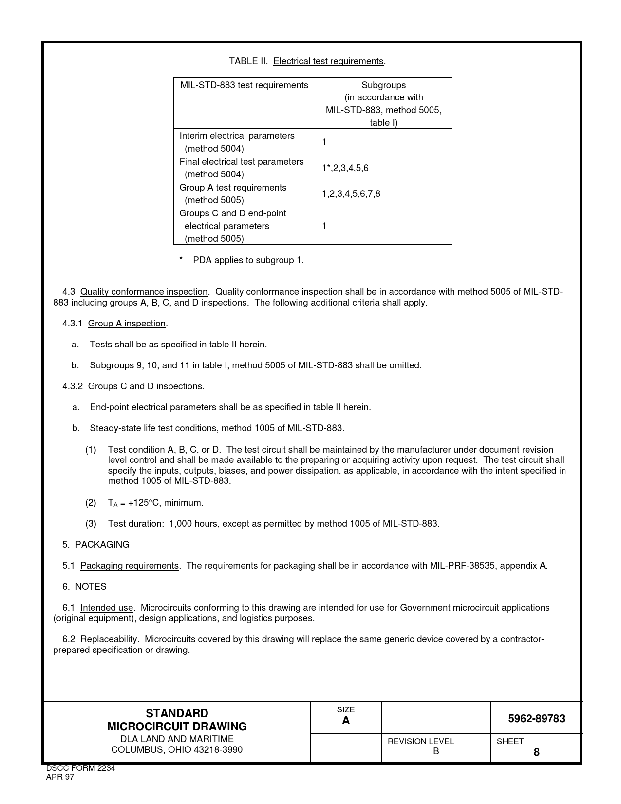 TABLE II. Electrical test requirements. MIL-STD-883 test requirements Subgroups (in accordance with MIL-STD-883, method 5005, table I) Interim electrical parameters 1 (method 5004) Final electrical test parameters 1*,2,3,4,5,6 (method 5004) Group A test requirements 1,2,3,4,5,6,7,8 (method 5005) Groups C and D end-point electrical parameters 1 (method 5005) * PDA applies to subgroup 1. 4.3 Quality conformance inspection. Quality conformance inspection shall be in accordance with method 5005 of MIL-STD- 883 including groups A, B, C, and D inspections. The following additional criteria shall apply. 4.3.1 Group A inspection. a. Tests shall be as specified in table II herein. b. Subgroups 9, 10, and 11 in table I, method 5005 of MIL-STD-883 shall be omitted. 4.3.2 Groups C and D inspections. a. End-point electrical parameters shall be as specified in table II herein. b. Steady-state life test conditions, method 1005 of MIL-STD-883. (1) Test condition A, B, C, or D. The test circuit shall be maintained by the manufacturer under document revision level control and shall be made available to the preparing or acquiring activity upon request. The test circuit shall specify the inputs, outputs, biases, and power dissipation, as applicable, in accordance with the intent specified in method 1005 of MIL-STD-883. (2) TA = +125°C, minimum. (3) Test duration: 1,000 hours, except as permitted by method 1005 of MIL-STD-883. 5. PACKAGING 5.1 Packaging requirements. The requirements for packaging shall be in accordance with MIL-PRF-38535, appendix A. 6. NOTES 6.1 Intended use. Microcircuits conforming to this drawing are intended for use for Government microcircuit applications (original equipment), design applications, and logistics purposes. 6.2 Replaceability. Microcircuits covered by this drawing will replace the same generic device covered by a contractor- prepared specification or drawing.