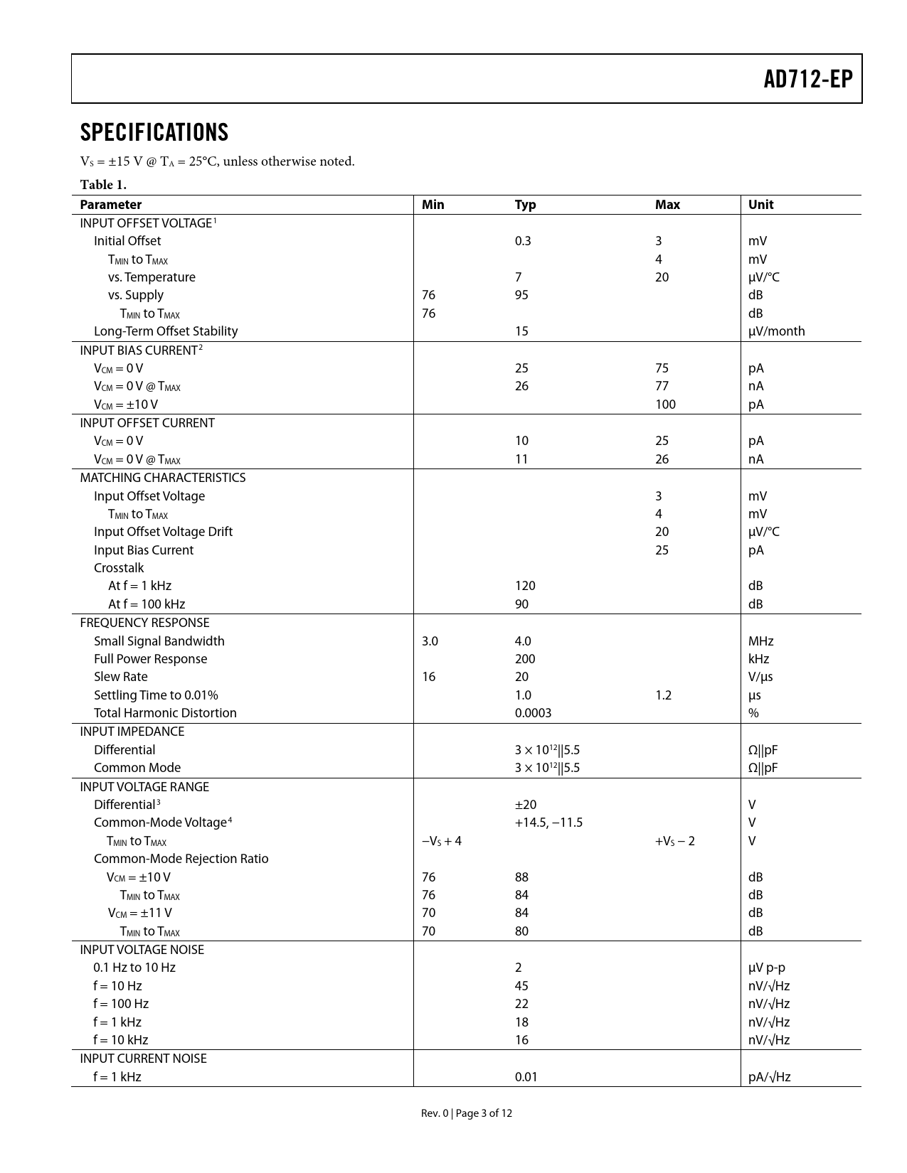 INPUT OFFSET VOLTAGE1 Initial Offset 0.3 3 mV TMIN to TMAX 4 mV vs. Temperature 7 20 μV/°C vs. Supply 76 95 dB TMIN to TMAX 76 dB Long-Term Offset Stability 15 μV/month INPUT BIAS CURRENT2 VCM = 0 V 25 75 pA VCM = 0 V @ TMAX 26 77 nA VCM = ±10 V 100 pA INPUT OFFSET CURRENT VCM = 0 V 10 25 pA VCM = 0 V @ TMAX 11 26 nA MATCHING CHARACTERISTICS Input Offset Voltage 3 mV TMIN to TMAX 4 mV Input Offset Voltage Drift 20 μV/°C Input Bias Current 25 pA Crosstalk At f = 1 kHz 120 dB At f = 100 kHz 90 dB FREQUENCY RESPONSE Small Signal Bandwidth 3.0 4.0 MHz Full Power Response 200 kHz Slew Rate 16 20 V/μs Settling Time to 0.01% 1.0 1.2 μs Total Harmonic Distortion 0.0003 % INPUT IMPEDANCE Differential 3 × 1012||5.5 Ω||pF Common Mode 3 × 1012||5.5 Ω||pF INPUT VOLTAGE RANGE Differential3 ±20 V Common-Mode Voltage4 +14.5, −11.5 V TMIN to TMAX −VS + 4 +VS − 2 V Common-Mode Rejection Ratio VCM = ±10 V 76 88 dB TMIN to TMAX 76 84 dB VCM = ±11 V 70 84 dB TMIN to TMAX 70 80 dB INPUT VOLTAGE NOISE 0.1 Hz to 10 Hz 2 μV p-p f = 10 Hz 45 nV/√Hz f = 100 Hz 22 nV/√Hz f = 1 kHz 18 nV/√Hz f = 10 kHz 16 nV/√Hz INPUT CURRENT NOISE f = 1 kHz 0.01 pA/√Hz Rev. 0 | Page 3 of 12 Document Outline FEATURES GENERAL DESCRIPTION CONNECTION DIAGRAM TABLE OF CONTENTS REVISION HISTORY SPECIFICATIONS ABSOLUTE MAXIMUM RATINGS ESD CAUTION TYPICAL PERFORMANCE CHARACTERISTICS OUTLINE DIMENSIONS ORDERING GUIDE