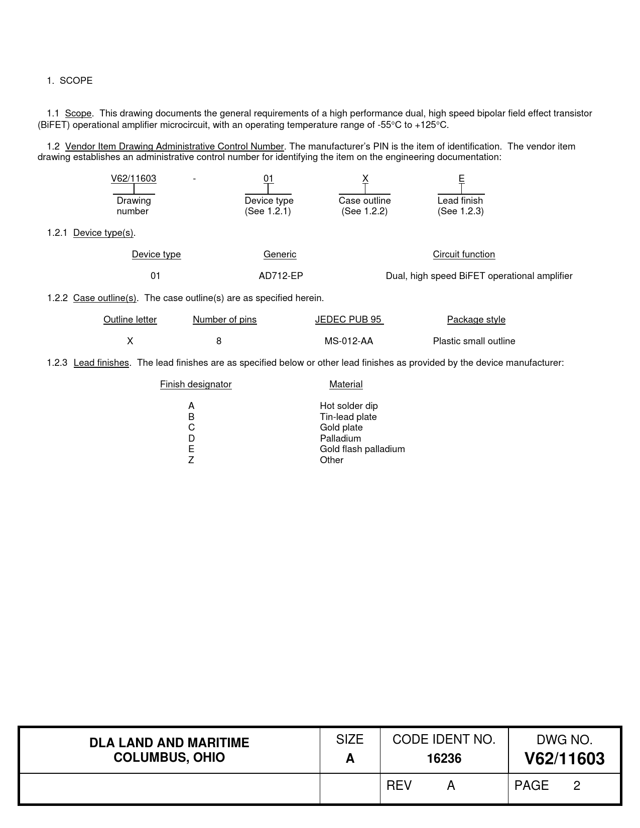 1. SCOPE 1.1 Scope. This drawing documents the general requirements of a high performance dual, high speed bipolar field effect transistor (BiFET) operational amplifier microcircuit, with an operating temperature range of -55C to +125C. 1.2 Vendor Item Drawing Administrative Control Number. The manufacturer’s PIN is the item of identification. The vendor item drawing establishes an administrative control number for identifying the item on the engineering documentation: V62/11603 - 01 X E Drawing Device type Case outline Lead finish number (See 1.2.1) (See 1.2.2) (See 1.2.3) 1.2.1 Device type(s). Device type Generic Circuit function 01 AD712-EP Dual, high speed BiFET operational amplifier 1.2.2 Case outline(s). The case outline(s) are as specified herein. Outline letter Number of pins JEDEC PUB 95 Package style X 8 MS-012-AA Plastic small outline 1.2.3 Lead finishes. The lead finishes are as specified below or other lead finishes as provided by the device manufacturer: Finish designator Material A Hot solder dip B Tin-lead plate C Gold plate D Palladium E Gold flash palladium Z Other DLA LAND AND MARITIME SIZE CODE IDENT NO. DWG NO. COLUMBUS, OHIOA16236V62/11603 REV A PAGE 2