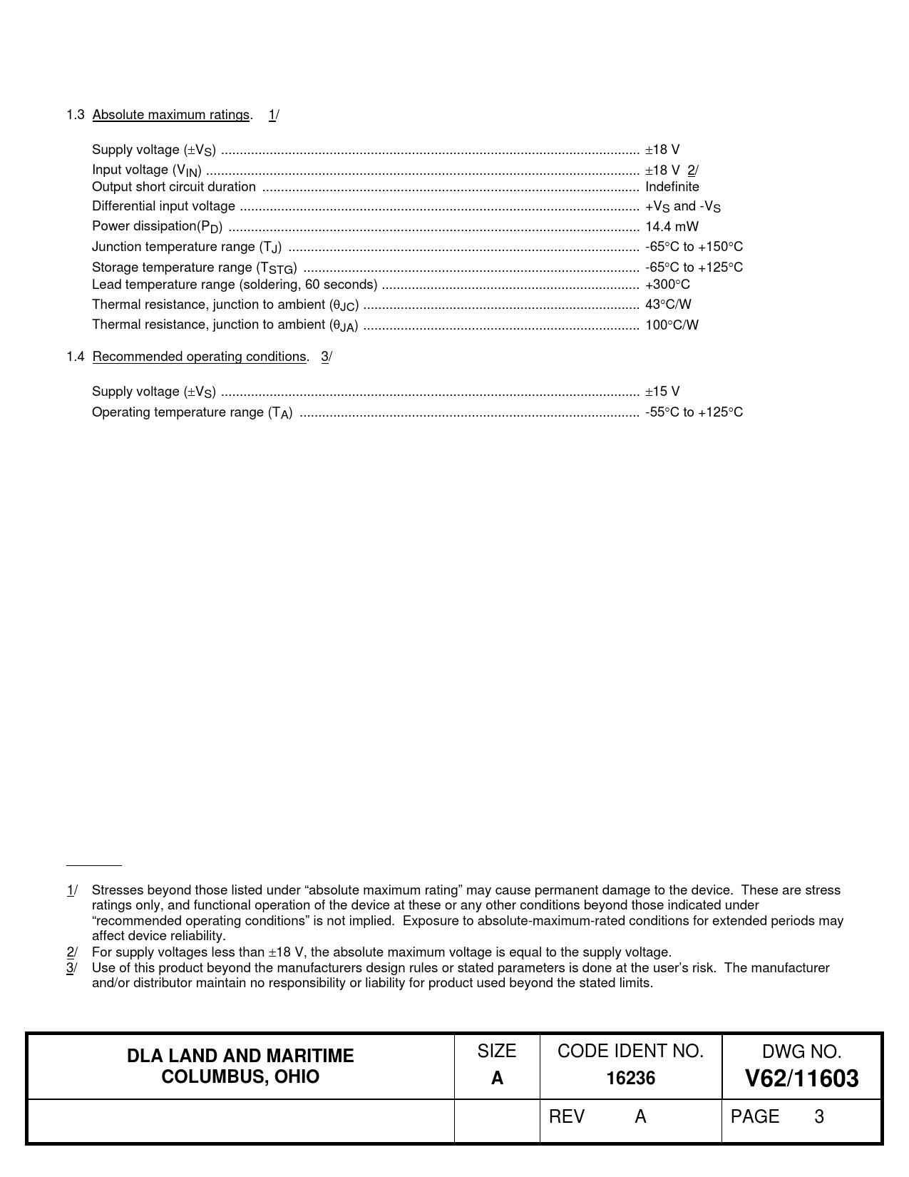 1.3 Absolute maximum ratings. 1/ Supply voltage (VS) .. 18 V Input voltage (VIN) .. 18 V 2/ Output short circuit duration ... Indefinite Differential input voltage ... +VS and -VS Power dissipation(PD) .. 14.4 mW Junction temperature range (TJ) .. -65C to +150C Storage temperature range (TSTG) .. -65C to +125C Lead temperature range (soldering, 60 seconds) ... +300C Thermal resistance, junction to ambient (JC) .. 43C/W Thermal resistance, junction to ambient (JA) .. 100C/W 1.4 Recommended operating conditions. 3/ Supply voltage (VS) .. 15 V Operating temperature range (TA) ... -55C to +125C 1/ Stresses beyond those listed under “absolute maximum rating” may cause permanent damage to the device. These are stress ratings only, and functional operation of the device at these or any other conditions beyond those indicated under “recommended operating conditions” is not implied. Exposure to absolute-maximum-rated conditions for extended periods may affect device reliability. 2/ For supply voltages less than 18 V, the absolute maximum voltage is equal to the supply voltage. 3/ Use of this product beyond the manufacturers design rules or stated parameters is done at the user’s risk. The manufacturer and/or distributor maintain no responsibility or liability for product used beyond the stated limits.