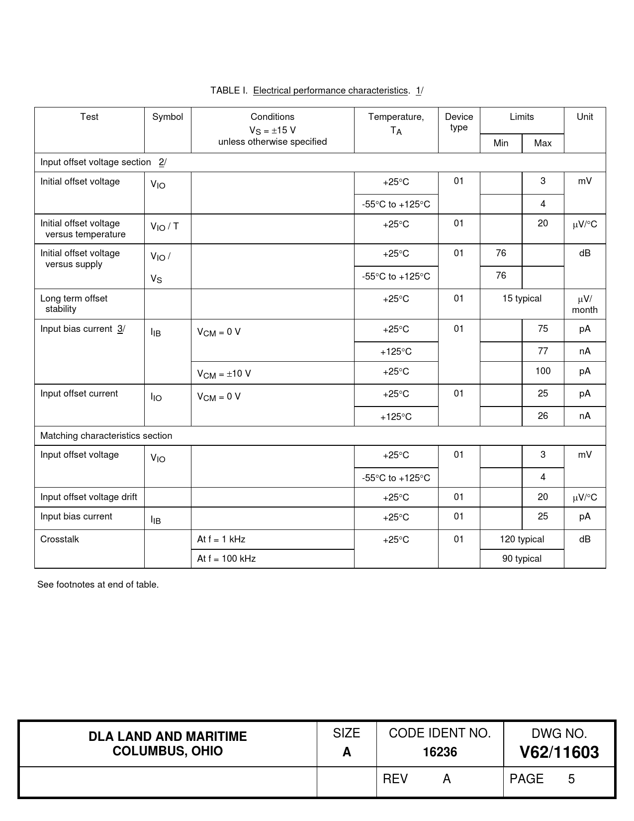 TABLE I. Electrical performance characteristics. 1/ Test Symbol Conditions Temperature, Device Limits Unit V type S = 15 V TA unless otherwise specified Min Max Input offset voltage section 2/ Initial offset voltage VIO +25C 01 3 mV -55C to +125C 4 Initial offset voltage VIO / T +25C 01 20 V/C versus temperature Initial offset voltage VIO / +25C 01 76 dB versus supply VS -55C to +125C 76 Long term offset +25C 01 15 typical V/ stability month Input bias current 3/ IIB VCM = 0 V +25C 01 75 pA +125C 77 nA VCM = 10 V +25C 100 pA Input offset current IIO VCM = 0 V +25C 01 25 pA +125C 26 nA Matching characteristics section Input offset voltage VIO +25C 01 3 mV -55C to +125C 4 Input offset voltage drift +25C 01 20 V/C Input bias current IIB +25C 01 25 pA Crosstalk At f = 1 kHz +25C 01 120 typical dB At f = 100 kHz 90 typical See footnotes at end of table. DLA LAND AND MARITIME SIZE CODE IDENT NO. DWG NO. COLUMBUS, OHIOA16236V62/11603 REV A PAGE 5