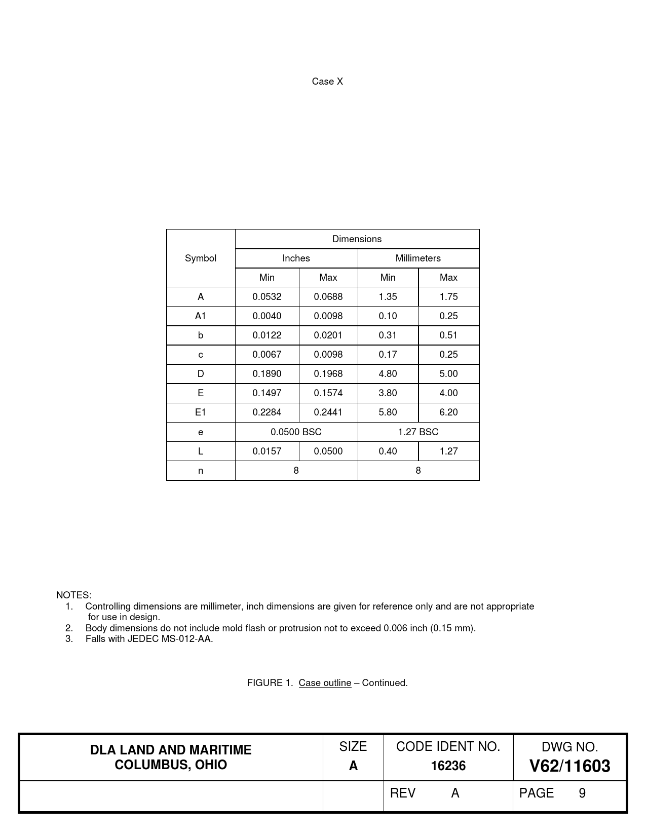 Case X Dimensions Symbol Inches Millimeters Min Max Min Max A 0.0532 0.0688 1.35 1.75 A1 0.0040 0.0098 0.10 0.25 b 0.0122 0.0201 0.31 0.51 c 0.0067 0.0098 0.17 0.25 D 0.1890 0.1968 4.80 5.00 E 0.1497 0.1574 3.80 4.00 E1 0.2284 0.2441 5.80 6.20 e 0.0500 BSC 1.27 BSC L 0.0157 0.0500 0.40 1.27 n 8 8 NOTES: 1. Controlling dimensions are millimeter, inch dimensions are given for reference only and are not appropriate for use in design. 2. Body dimensions do not include mold flash or protrusion not to exceed 0.006 inch (0.15 mm). 3. Falls with JEDEC MS-012-AA. FIGURE 1. Case outline – Continued.
